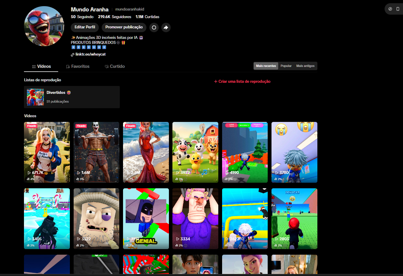 Conta: @mundoaranhakid Conta criada para conteúdo infantil focado no universo do Homem-Aranha, com vídeos voltados para crianças e fãs do personagem. 📊 Detalhes da conta: • Nicho: conteúdo infantil / herói (Homem-Aranha) • Público: crianças e fãs do personagem • Ideal para quem quer vender produtos infantis, fantasias, brinquedos ou criar conteúdo para esse público