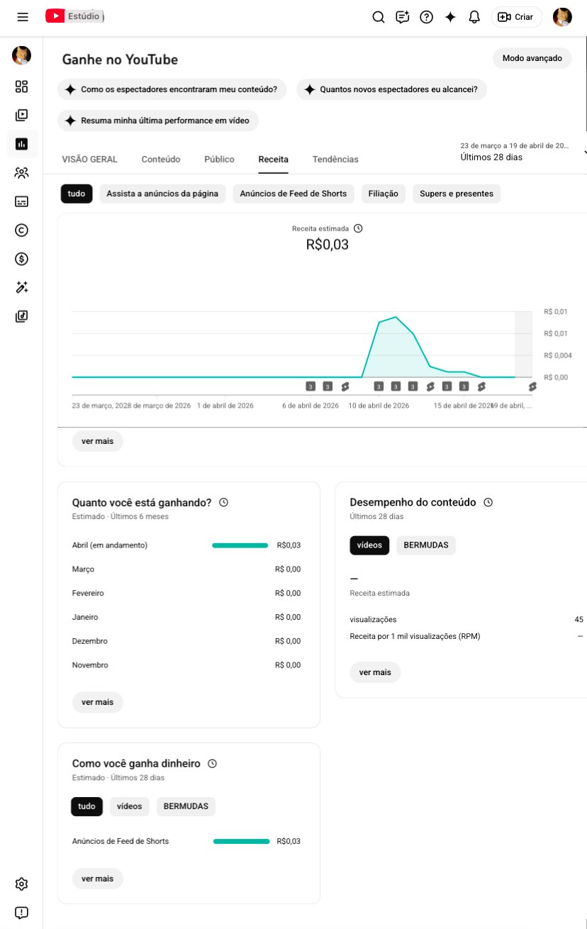 📊 Receita baixa (R$0,03) pois foi recém monetizado e já colocado à venda