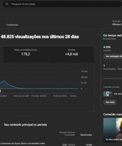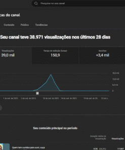 Conta com 43,1 mil visualizações totais e quase 200 horas de tempo de exibição, apresentando crescimento orgânico e bom desempenho geral.