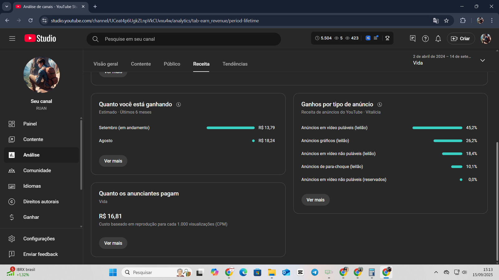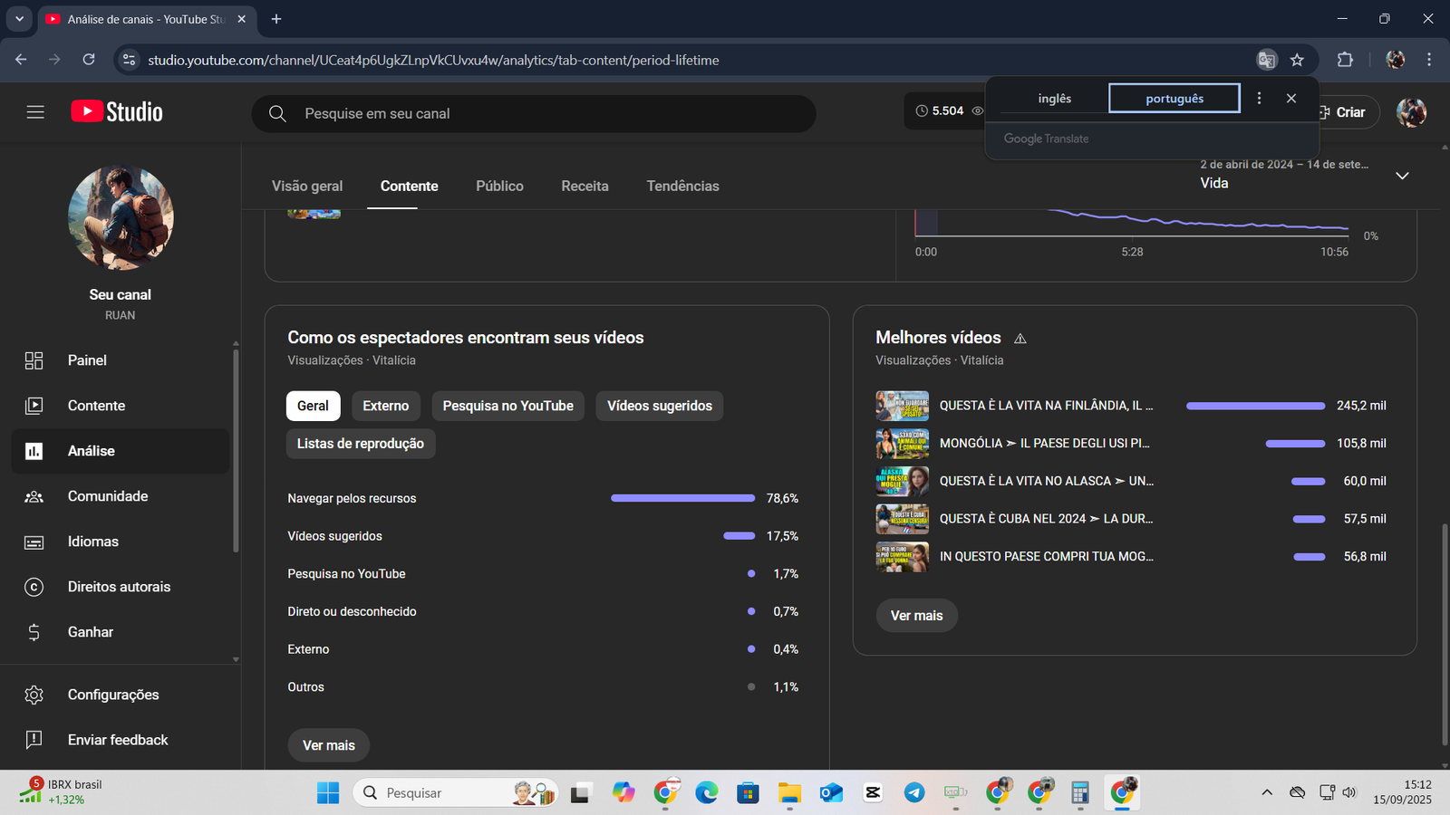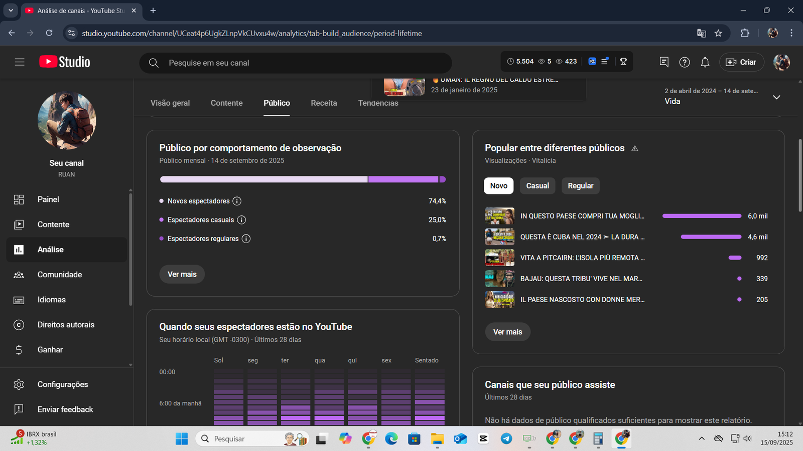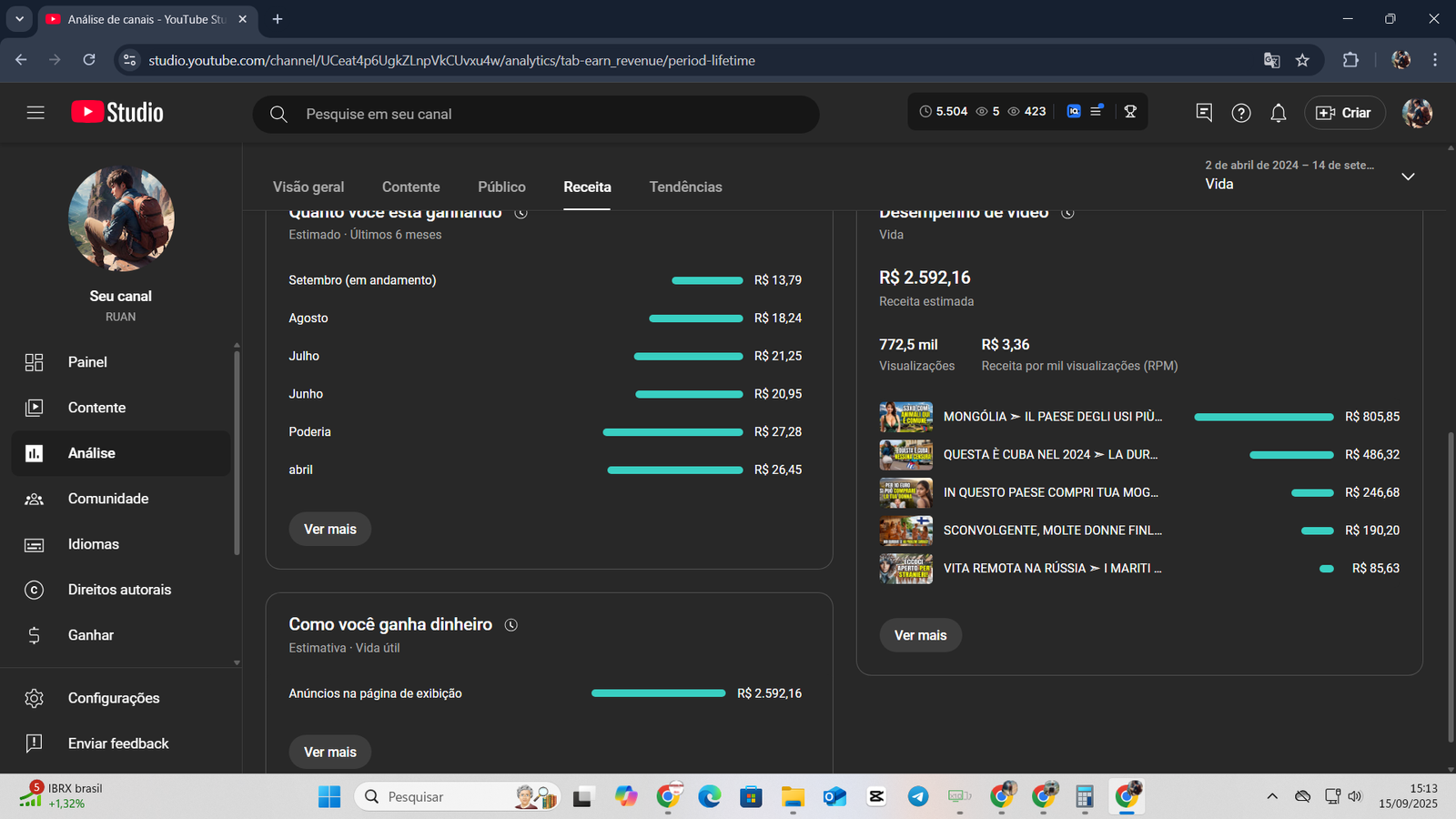 👉 Canal já monetizado e com público europeu (potencial de CPM alto).