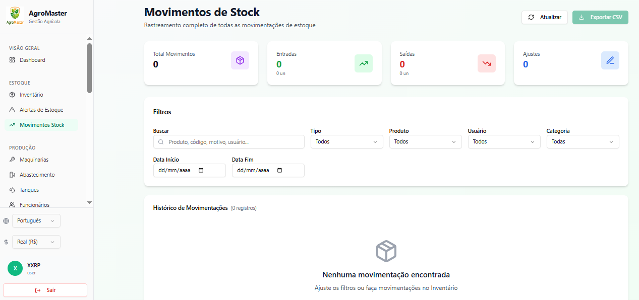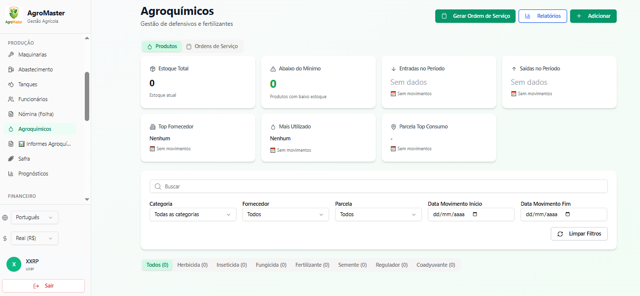 - Gerenciar agroquímicos com controle de estoque e movimentações