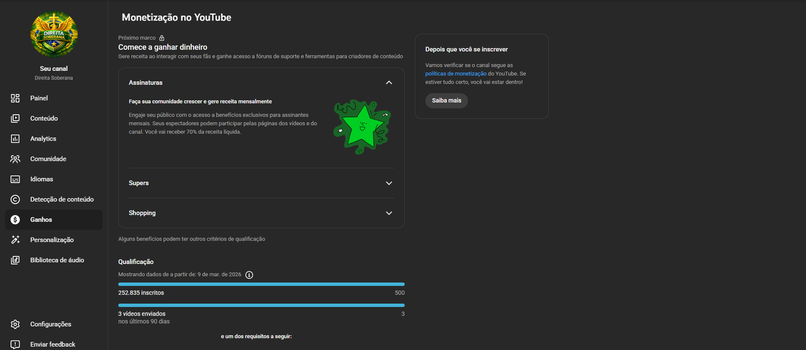 Adquirir um canal como Direita Soberana significa começar no YouTube muito à frente, com uma base já pronta para crescimento.