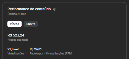 Canal saudável e fazendo dinheiro mesmo sem postar vídeo esse mês, é só voltar a postar e fazer dinheiro.