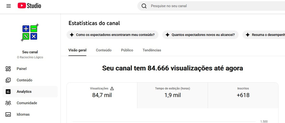 Canal com grande potencial para expansão, ideal para quem deseja trabalhar com conteúdo educativo, questões comentadas, desafios de lógica, dicas de matemática e vídeos curtos com alto poder de alcance.