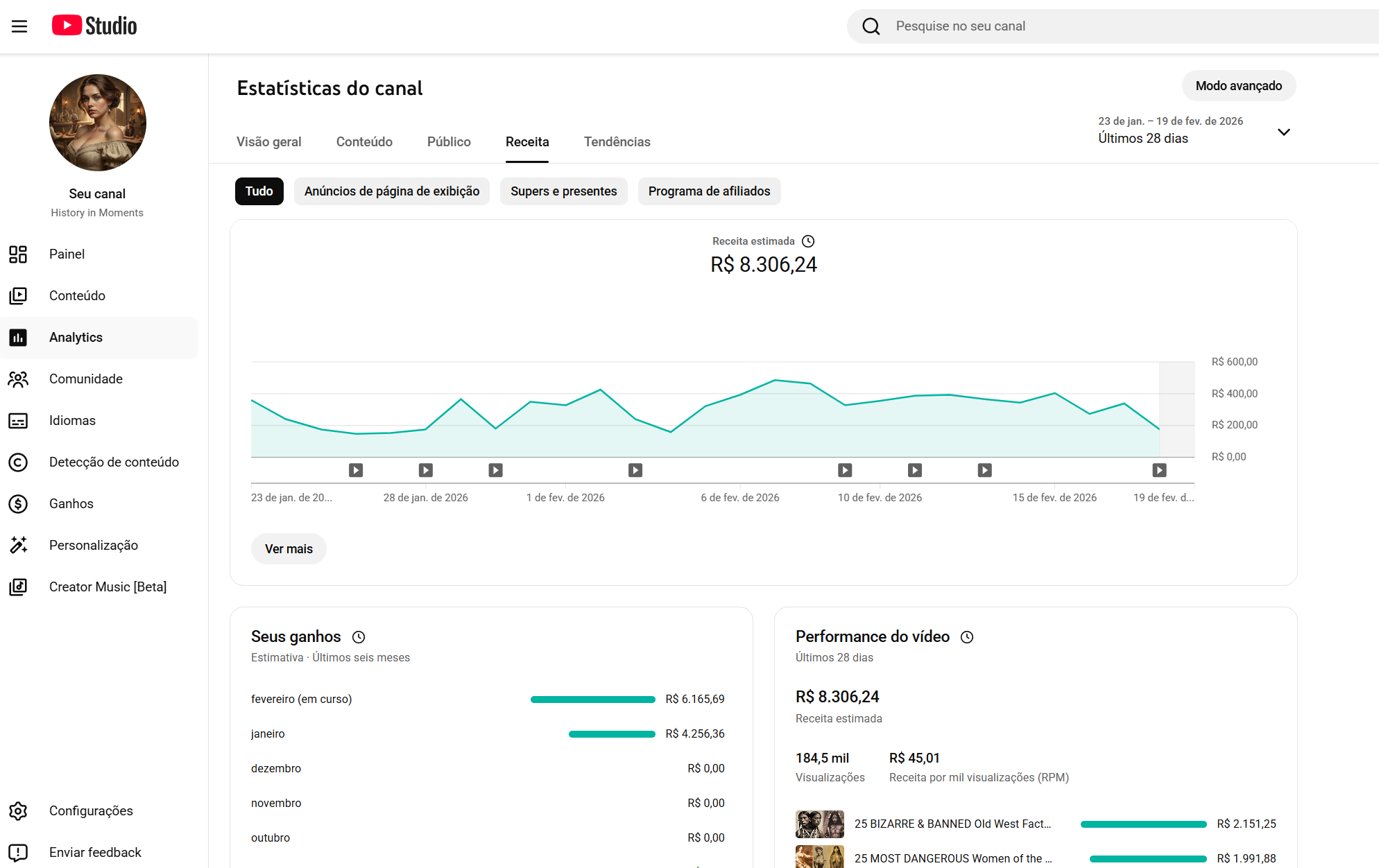 Canal dark em inglês no nicho História Antiga, já monetizado no AdSense e com público EUA (RPM alto). É literalmente um projeto pronto para operar: você assume, continua postando e já entra no jogo com um canal estruturado e validado, ideal pra quem quer faturar com consistência sem começar do zero, receita desse mês já passou de R$6000.