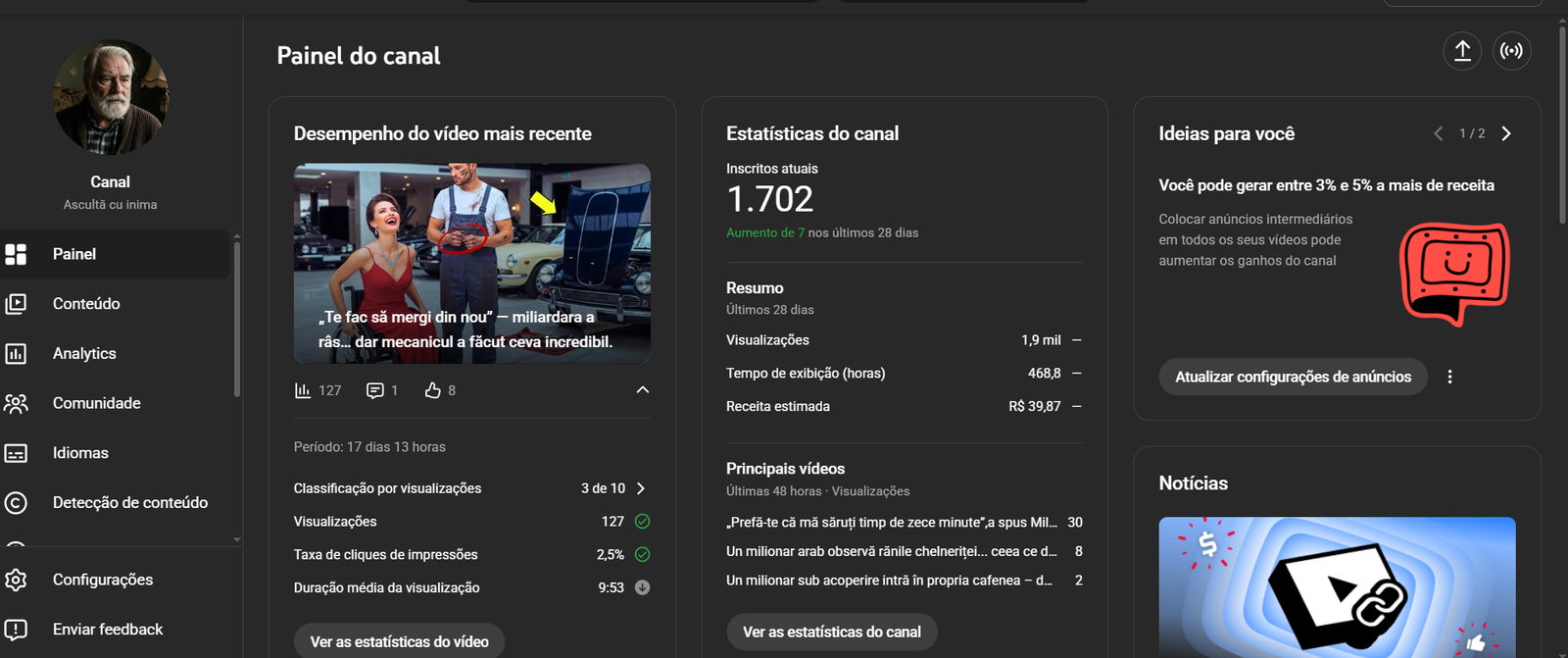 Estou colocando à venda um canal de historias que foi construído com cuidado, consistência e foco em conteúdo que realmente conecta com as pessoas. Hoje, o canal está 100% monetizado, sem qualquer restrição, e trabalha com um CPM médio em torno de R$R$ 32,53, o que o torna um excelente gerador de receita.