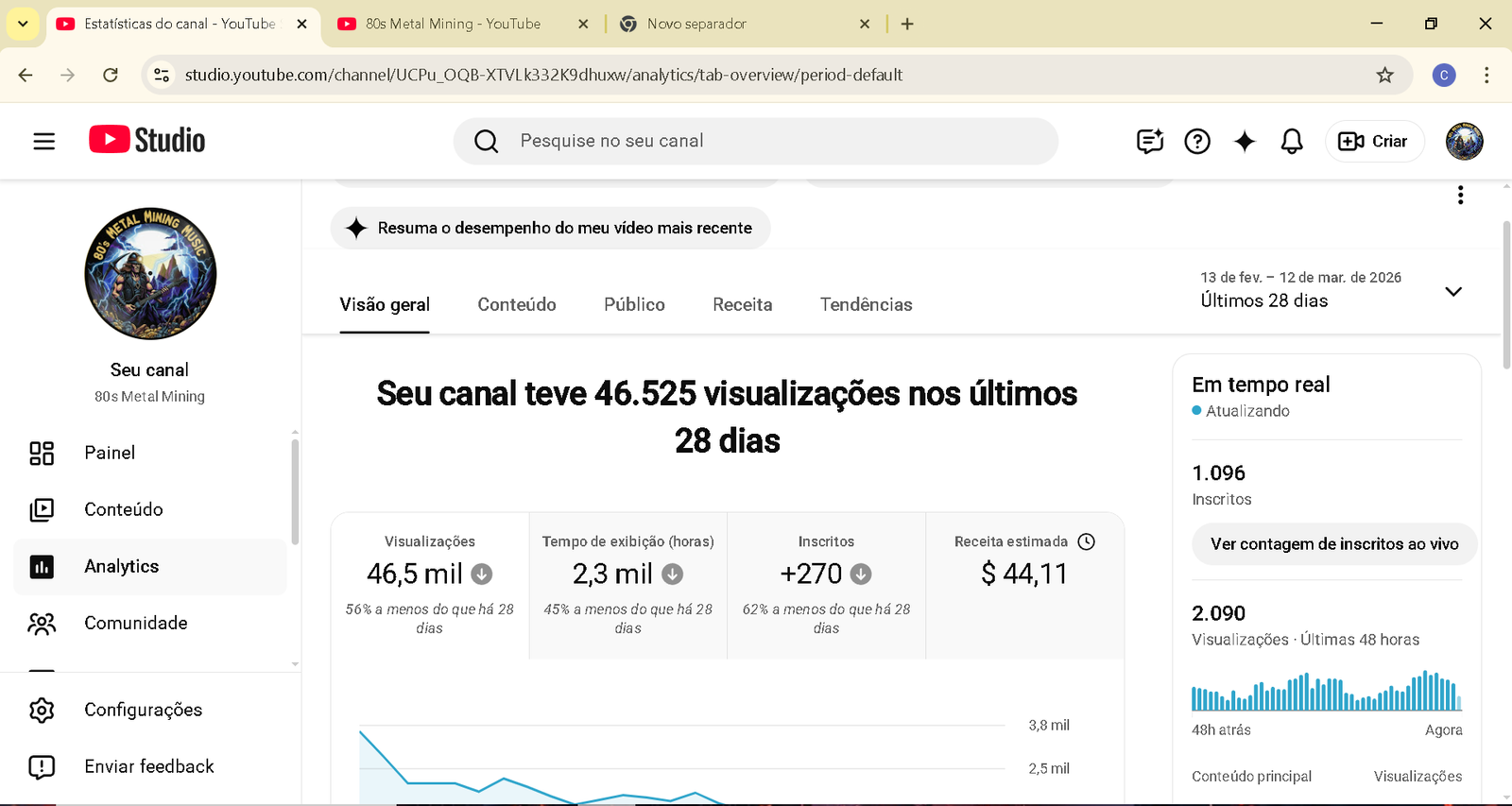 Canal muito bom, com público fiel e real, todo em inglês. Estou postando vídeos há cerca de 3 meses. As letras das músicas são feitas com o ChatGPT e a criação das músicas é feita com a Suno AI, um processo muito fácil de produzir. O canal possui ótimos números de RPM e CPM, com audiência principalmente dos Estados Unidos. Pode avaliar sem compromisso, é um excelente negócio. Estou vendendo apenas por falta de tempo para continuar administrando. https://www.youtube.com/@80s_metal_mining