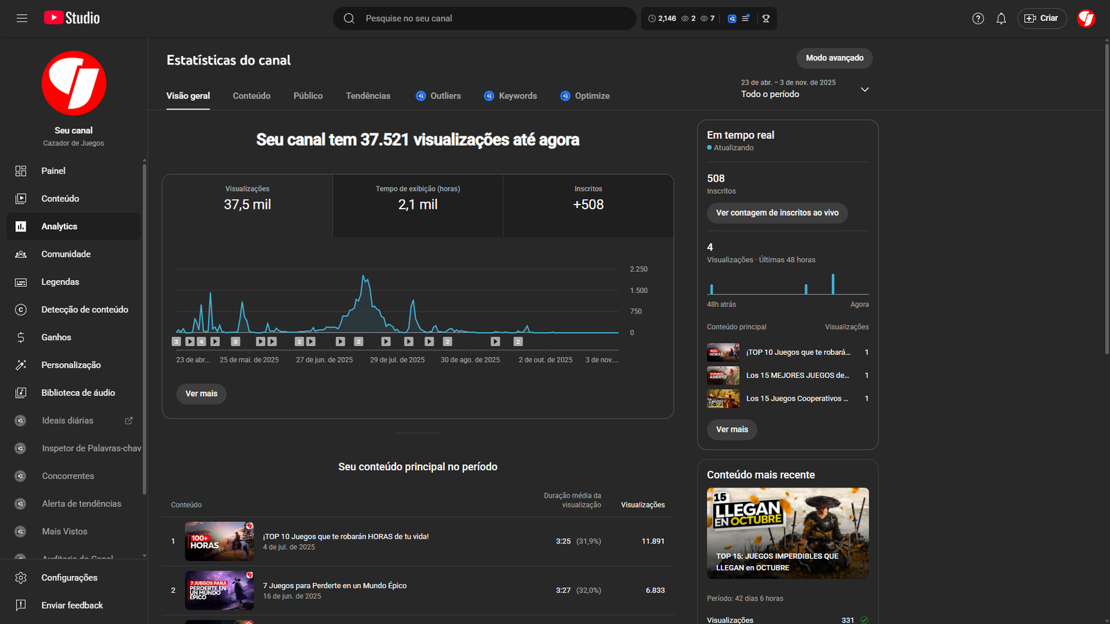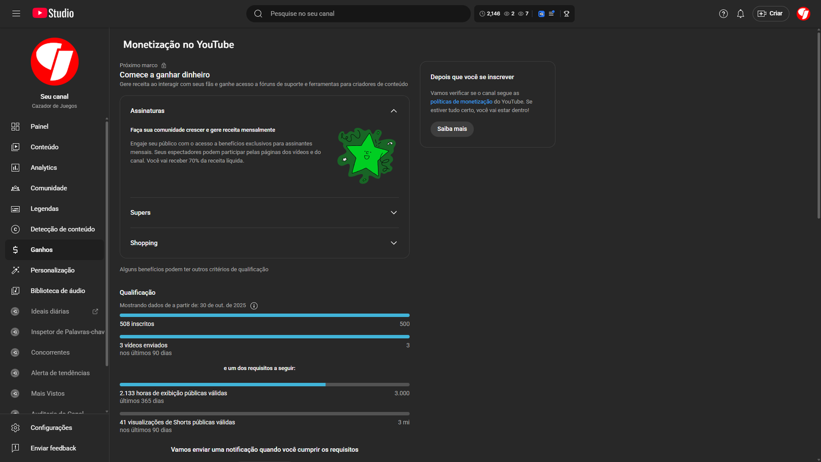 Canal no Youtube não monetizado, 500 Inscritos e pouco mais de 500k de impressões
