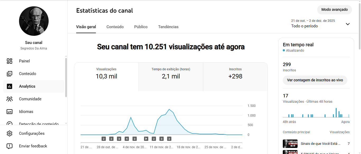 Canal Dark Quase Monetizando | 299 inscritos | +2143 mil horas | Nicho Carl Jung/Espiritualidade