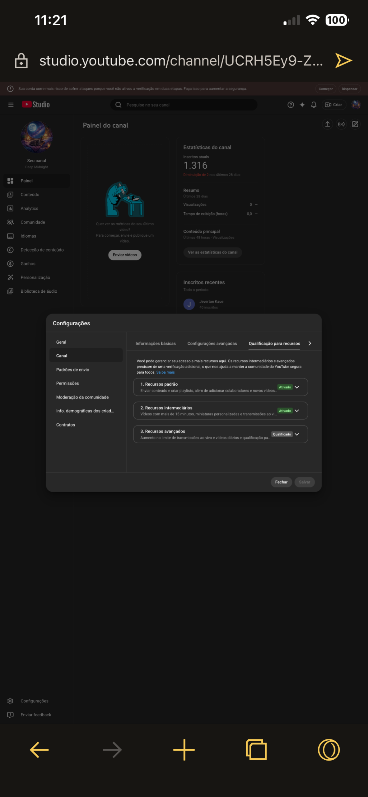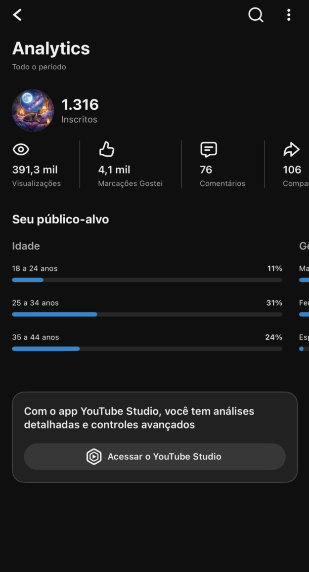 canal com 1316 inscritos, conta criada em 2021 mas usada só em 2025 por 2 meses