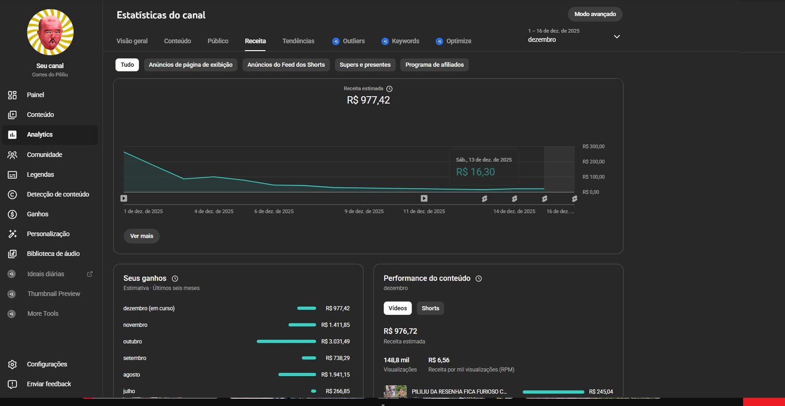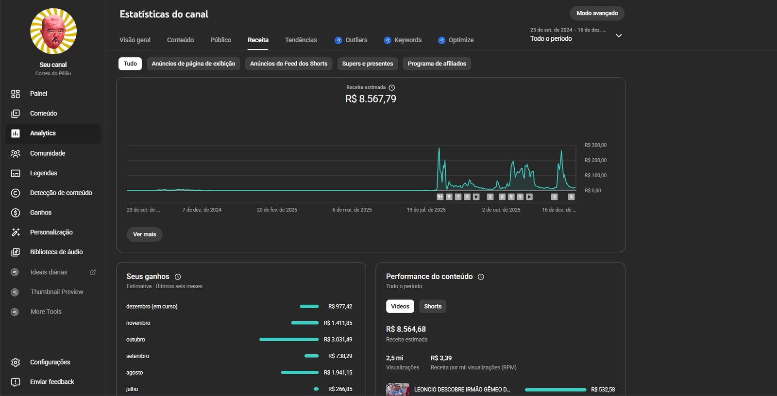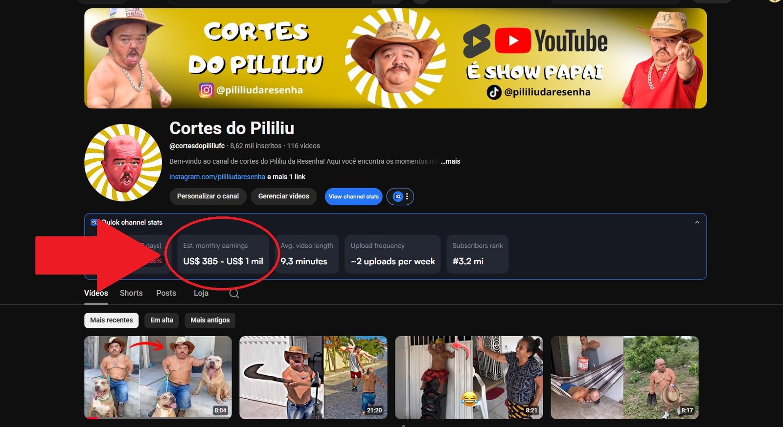 Canal gera renda de R$3.000 por mês — postando 2 vídeos por semana. Pode ver no histórico de ganhos que postei nas imagens.