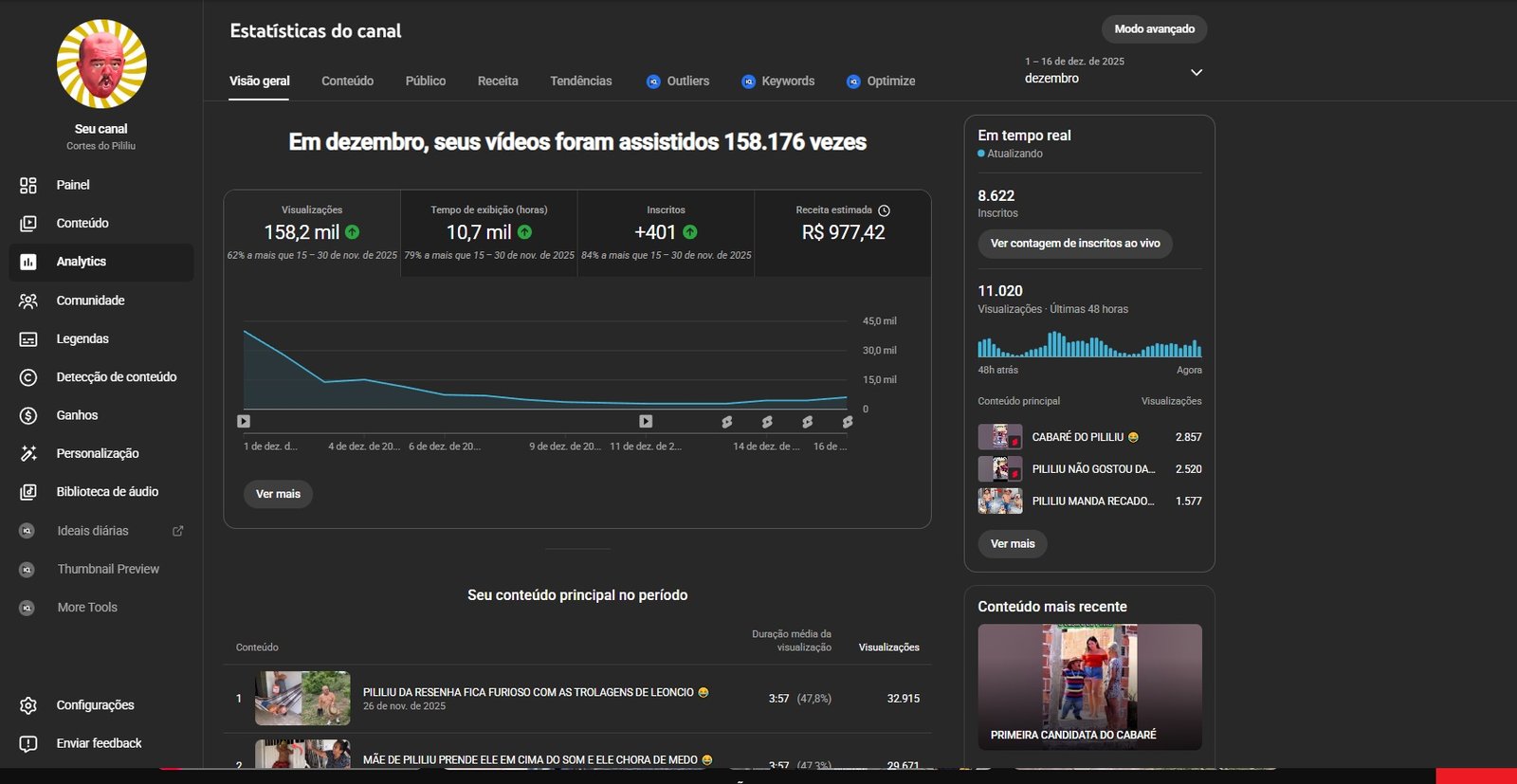 Como estou postando com menos frequência (geralmente 1 vídeo a cada 2 semanas) os ganhos estão reduzidos.