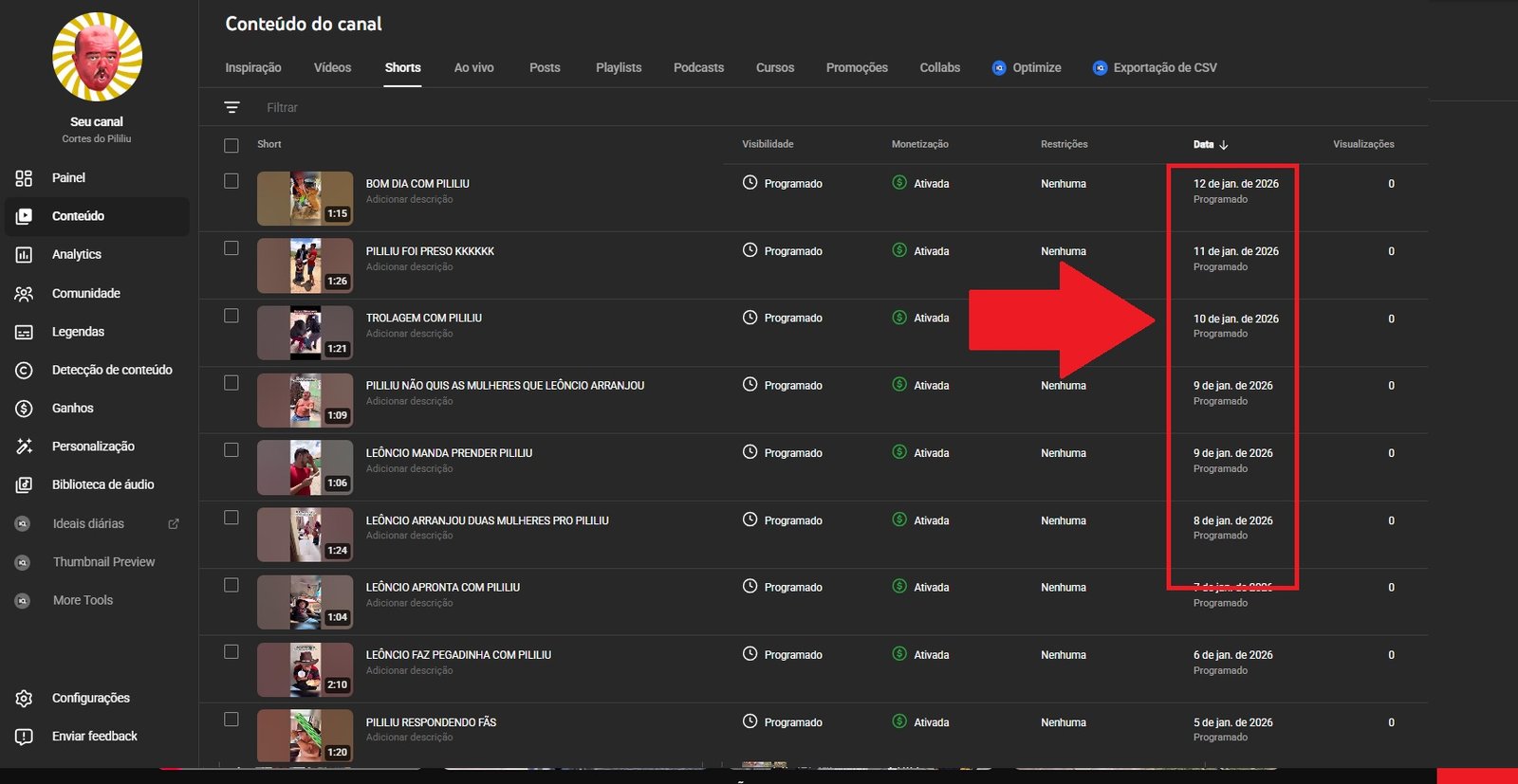 O canal já está com vários shorts programados para serem postados diariamente, não fazia shorts ainda, mas resolvi começar a postar.