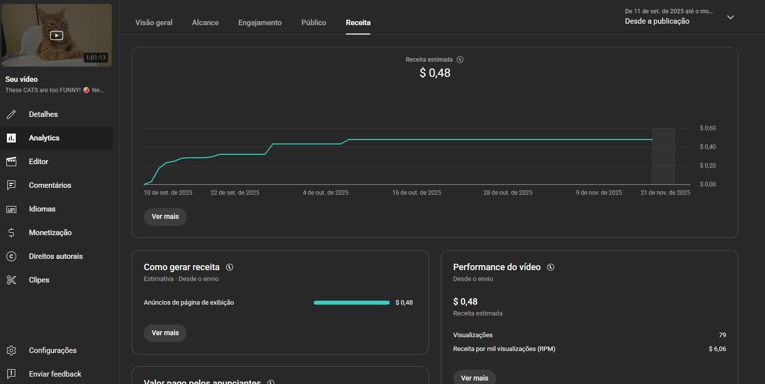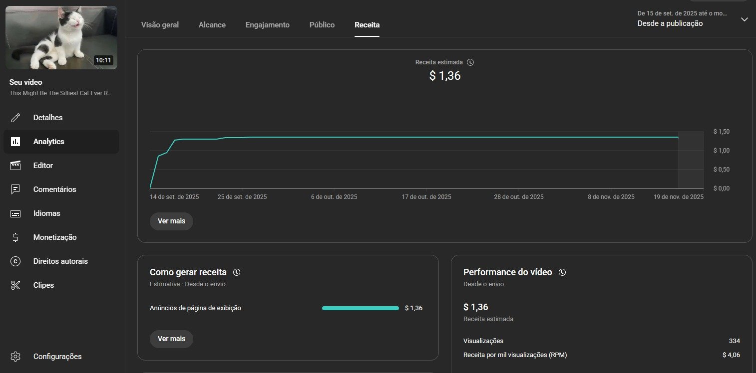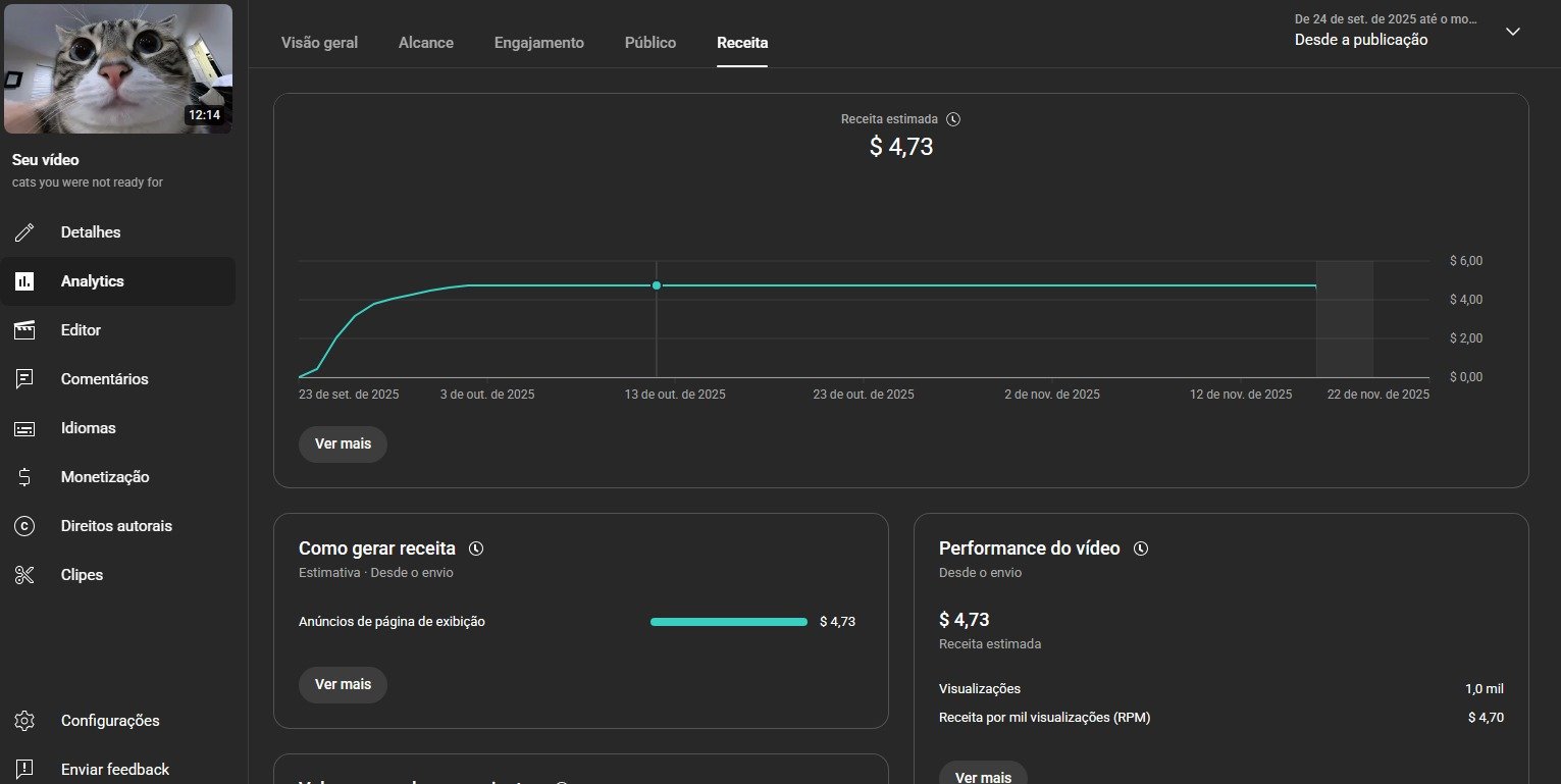 O nicho é gatos em inglês, um dos mais estáveis e seguros do YouTube, com RPM entre US$ 2,50 e US$ 6,00 — acima da média do entretenimento.