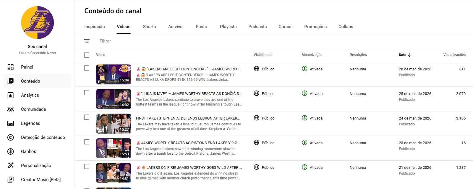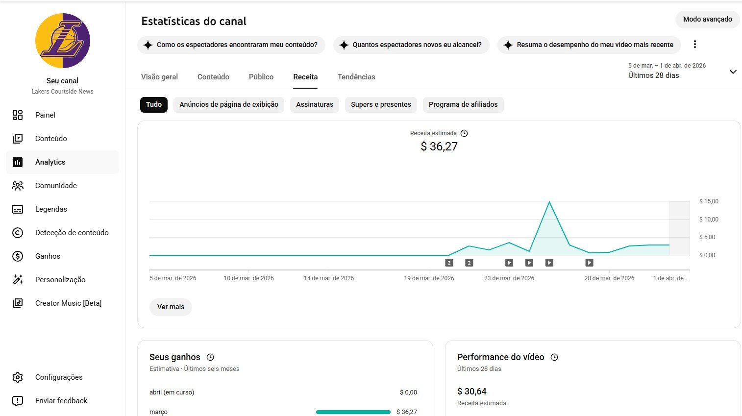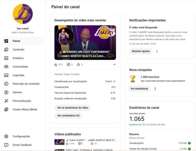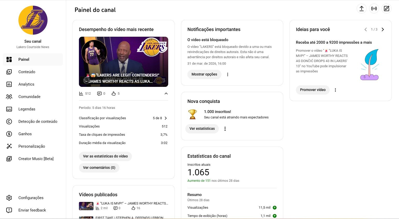 CANAL DE NBA DOS LAKERS- 1061 INSCRITOS MONETIZADO