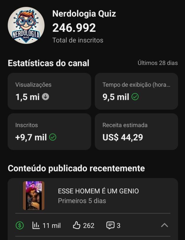 Se você quer entrar no YouTube com o pé direito e gastando pouco, o canal “Nerdologia Quiz” é a oportunidade que você esperava. Com mais de 247.000 inscritos e a monetização já aprovada, este canal é um ativo pronto para gerar receita imediata. O nicho de Quiz é um dos que mais cresce no formato Shorts, pois desafia o espectador, gera comentários e possui uma taxa de retenção altíssima — o combustível perfeito para o algoritmo do YouTube.