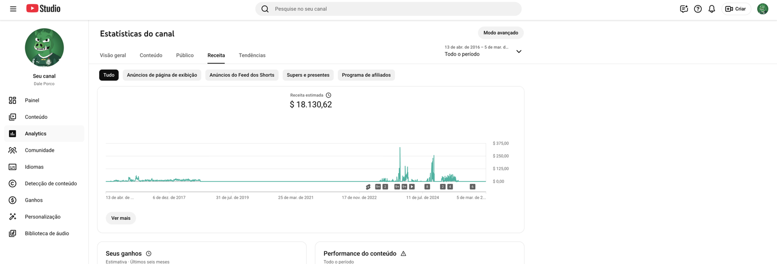 O canal está monetizado no YouTube e já gerou aproximadamente: