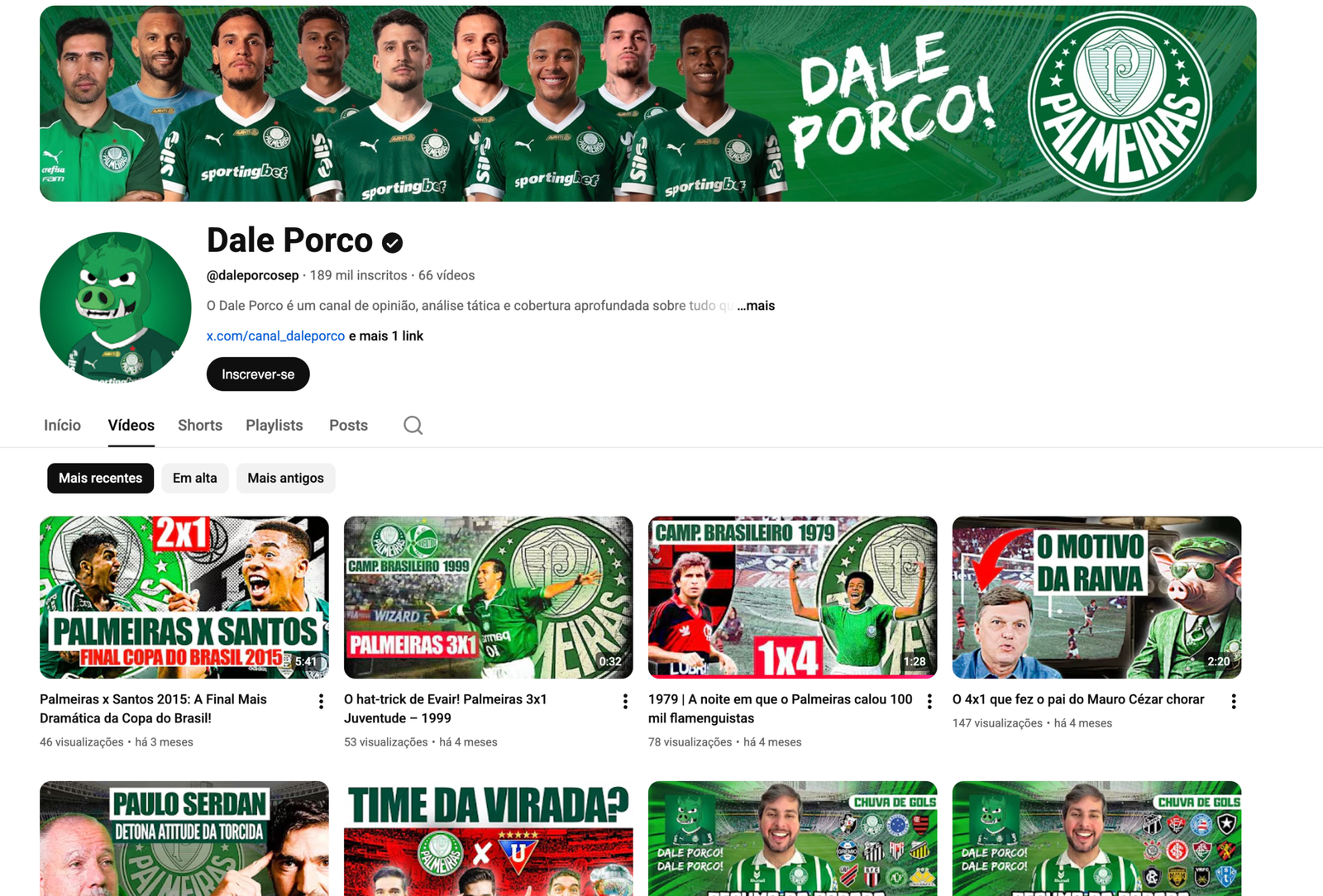💡 Por que o “Dale Porco” é um investimento diferenciado? Diferente de canais que dependem apenas do algoritmo, este ativo possui uma marca forte. O torcedor palmeirense é fiel e consome conteúdo diariamente: notícias de contratações, análises táticas e pré-jogos. Com 189k seguidores, você assume um canal que já é referência, garantindo visualizações orgânicas massivas e uma “voz” respeitada na comunidade alviverde.