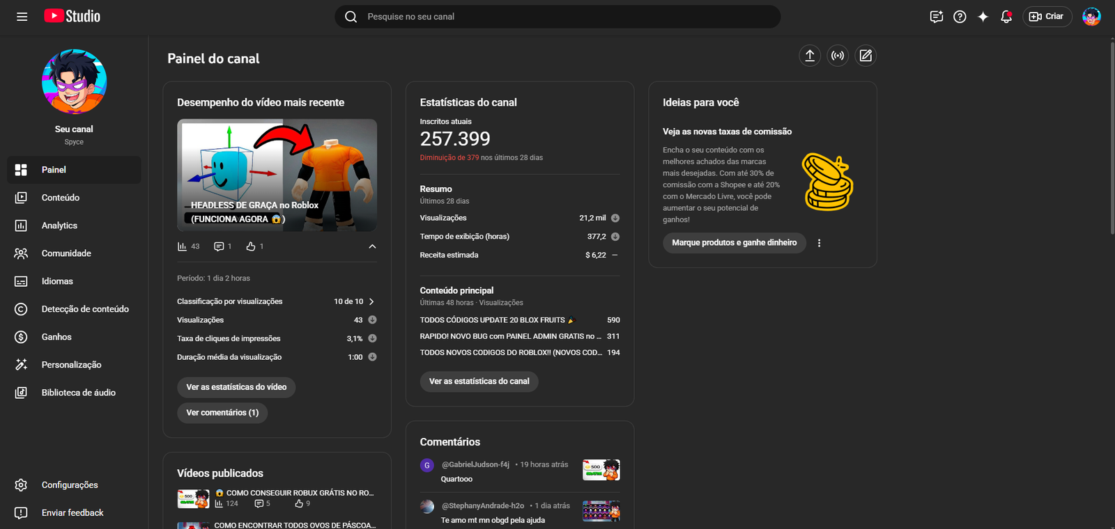 CANAL YOUTUBE MONETIZADO | 257K SUBS |+7,6 MILHÕES DE VIEWS