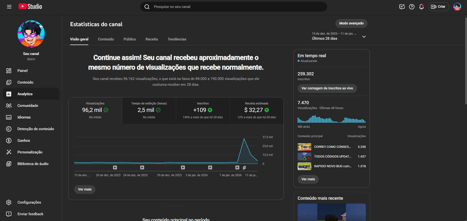 Canal do YouTube Spyce, consolidado no nicho Games, com foco principal em Roblox e conteúdos altamente engajados para o público gamer jovem. O canal possui 259 mil inscritos reais, construídos de forma orgânica, com forte autoridade no nicho e ótima aceitação do público.