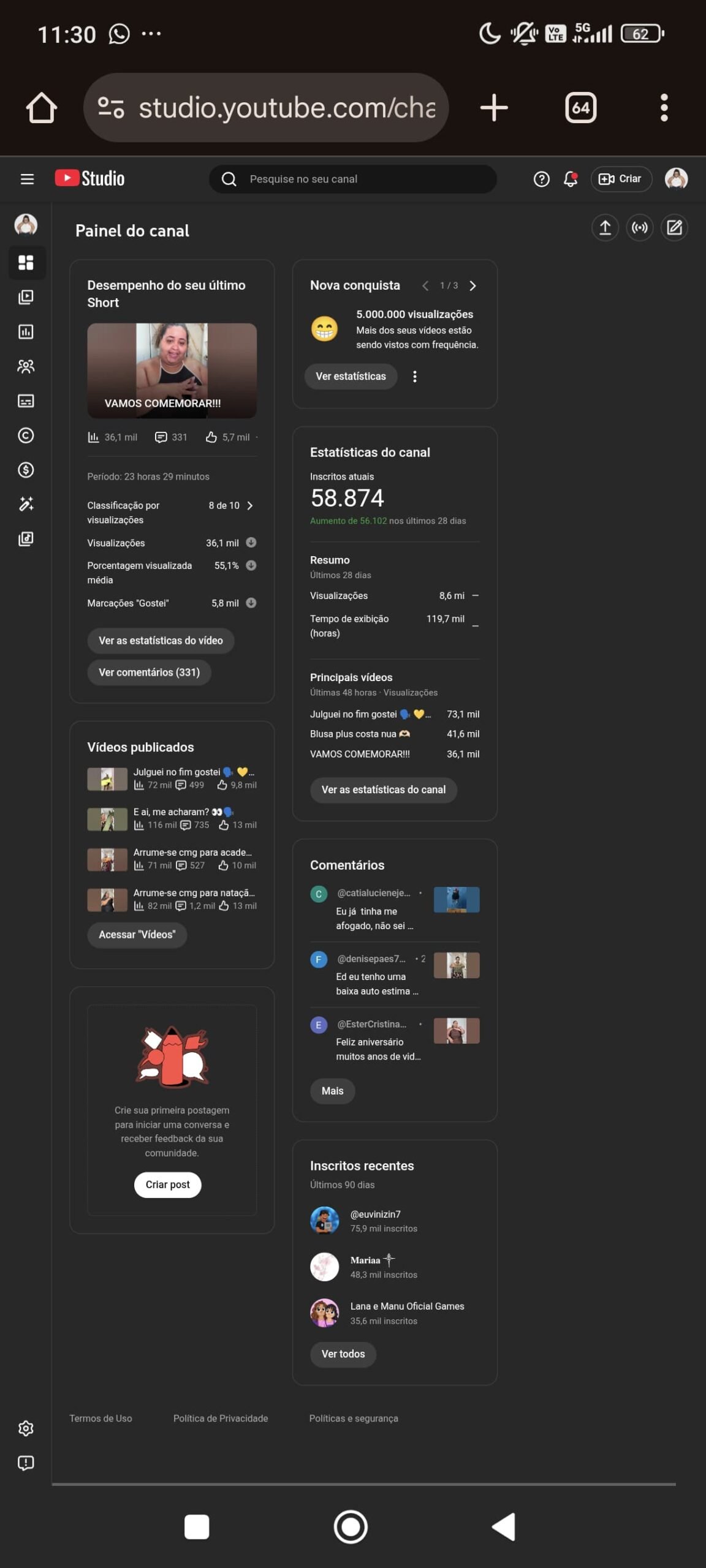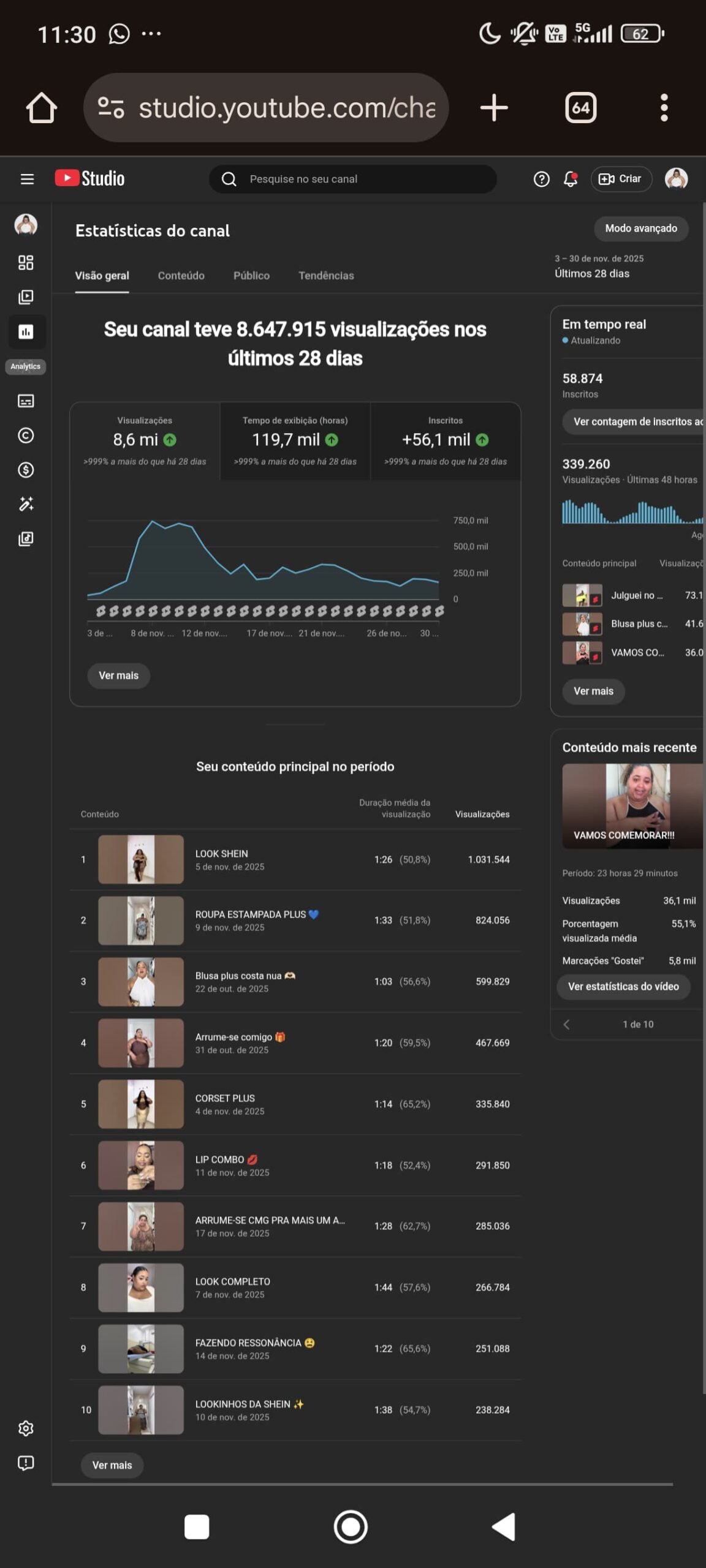 O canal está em crescimento constante, com excelente potencial para monetização via Shorts e parcerias. Ótimo para quem trabalha com lifestyle, beleza, entretenimento, reacts, vlogs curtos ou quer transformar o nicho conforme a estratégia.