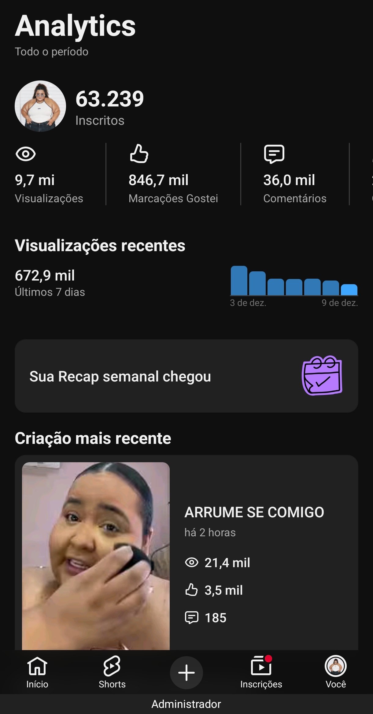 🔹 Conteúdo recente performando muito bem (ex.: vídeo com 21,4 mil views em 2 horas)