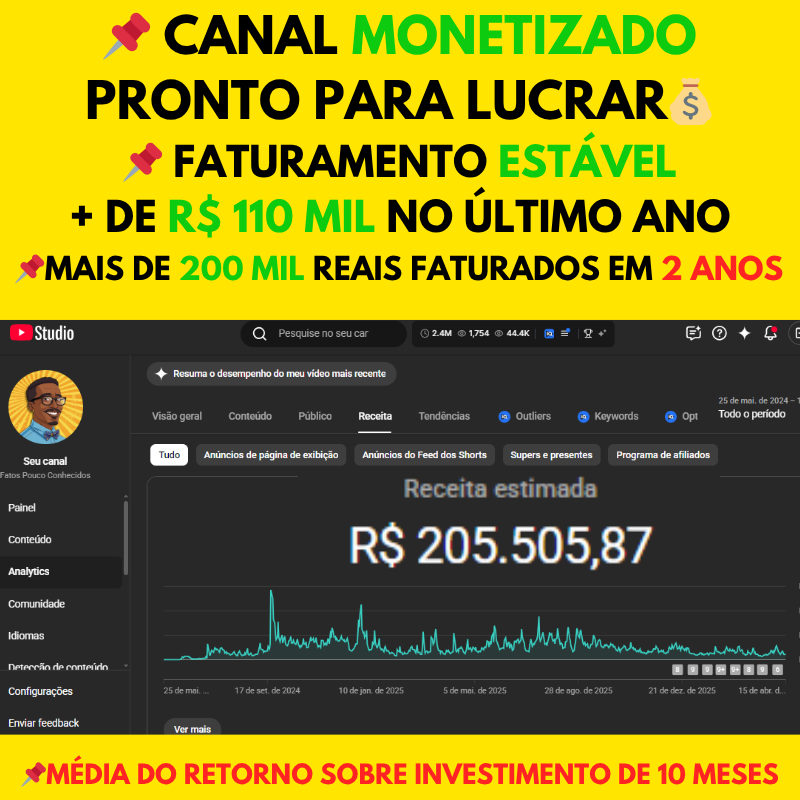 Canal monetizado com mais de R$ 109 mil faturados no último ano, 125 mil inscritos e média de 600 mil views mensais. Receita estável, baixo custo e alto potencial de escala — basta aumentar a produção para crescer o lucro. Inclui aula completa ensinando o modelo de produção.