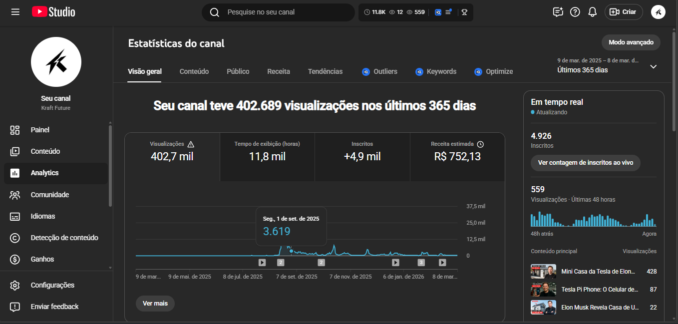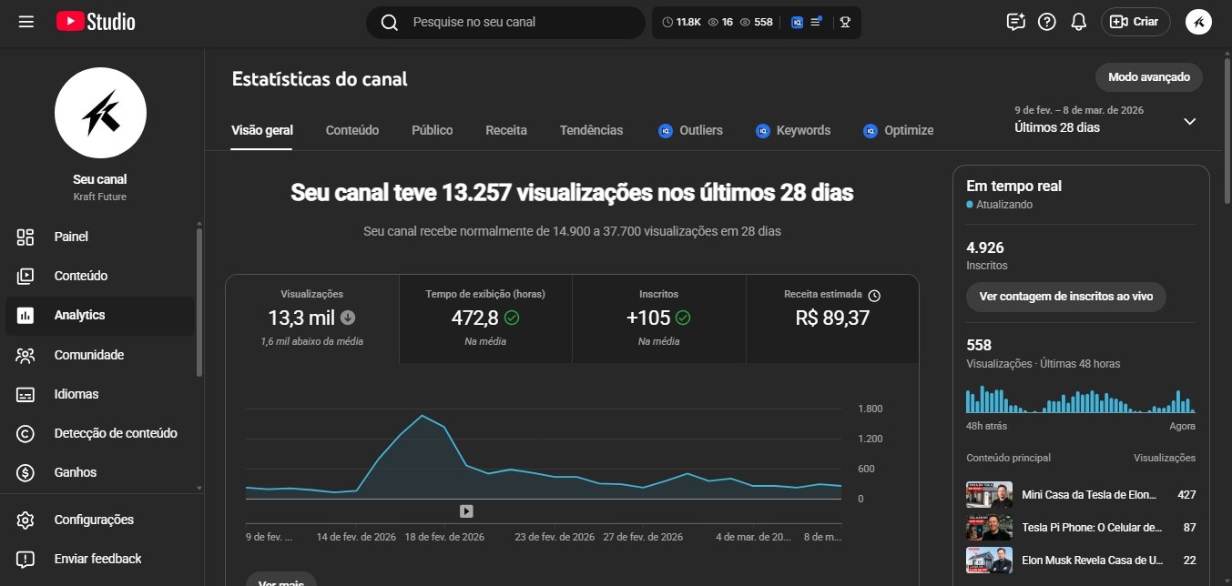 O canal já teve um bom desempenho em visualizações e crescimento. Nos últimos meses as views diminuíram porque não consegui manter uma frequência constante de postagem. Mesmo assim, o canal continua gerando receita mensal através do AdSense e alguns vídeos antigos ainda trazem visualizações de forma orgânica, com picos de views em determinados meses.
