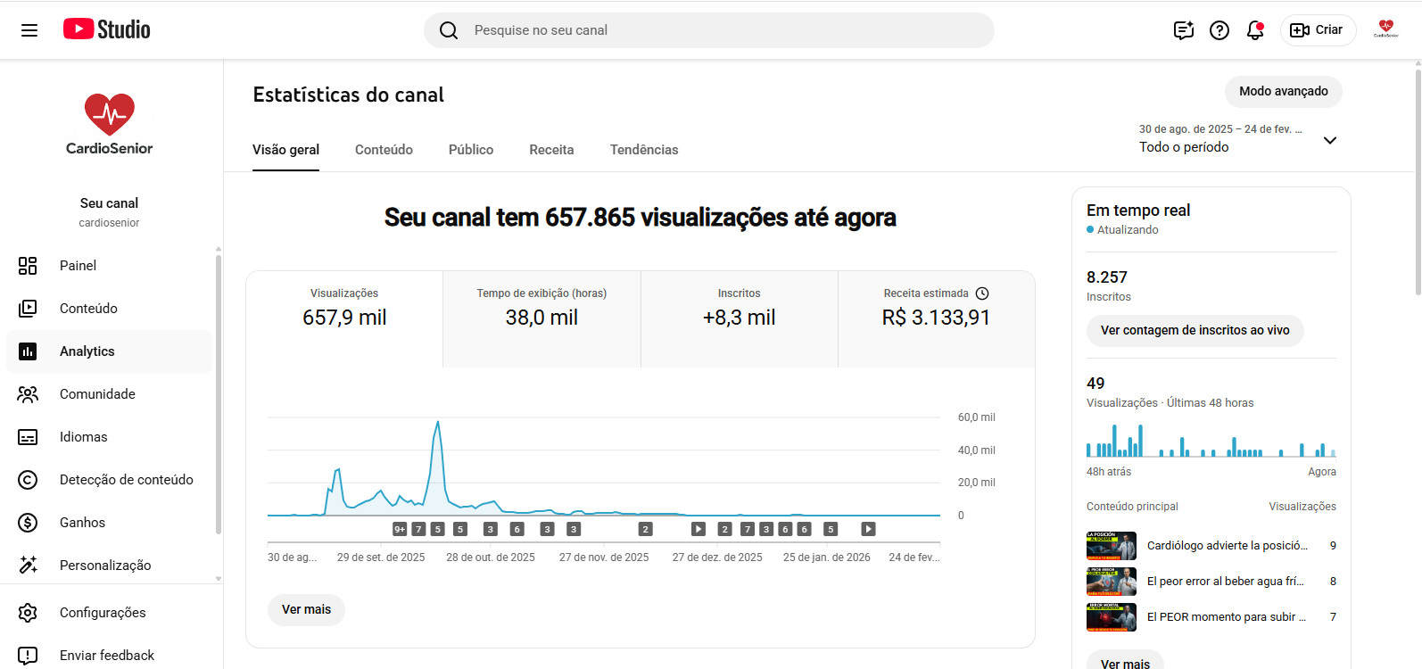 O canal @cardiosenior-Es é um ativo estratégico para quem busca rentabilidade acima da média. Focado em saúde cardiovascular e qualidade de vida para o público sênior, este canal atrai anunciantes de alto ticket (farmacêuticas, planos de saúde e suplementos), o que resulta em um dos maiores ganhos por mil visualizações da plataforma.