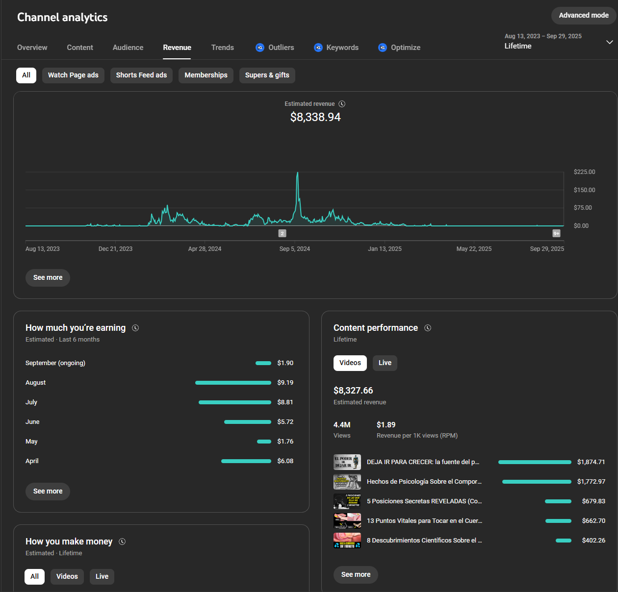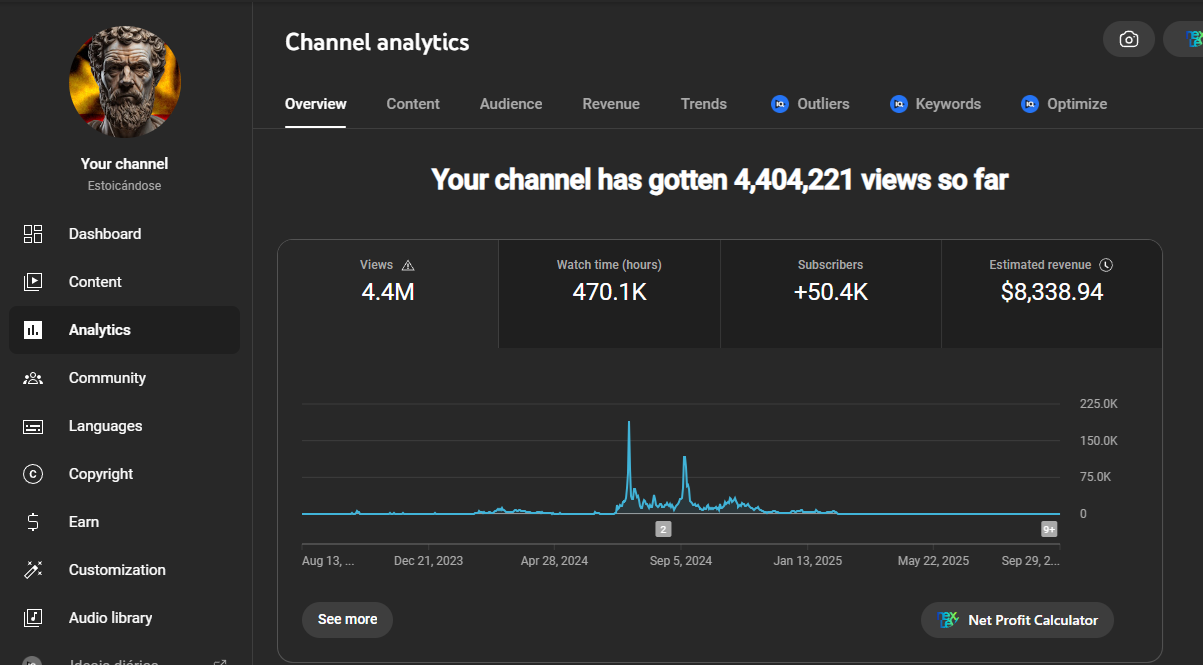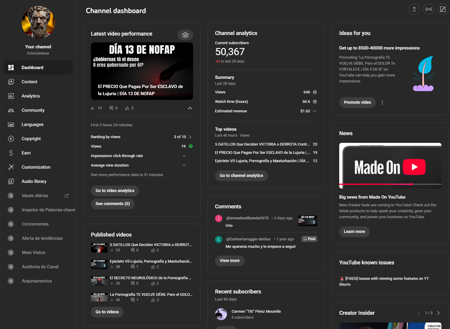 Canal criado em 2023. Já fez mais de R$ 50.000 no total com o nicho de estoicismo e depois fez uma boa grana trocando o subnicho p/ espiritualidade e lei da atração.