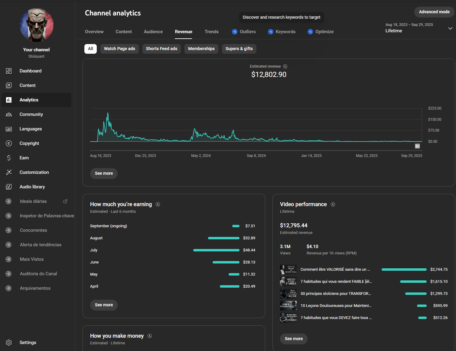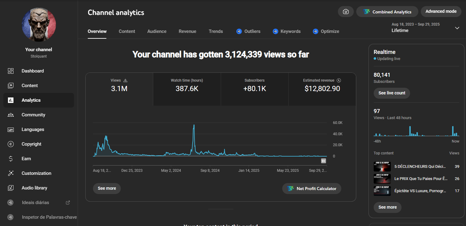 Canal criado em 2023. Já fez mais de R$ 70.000 no total com o nicho de estoicismo. Depois fez uma boa grana trocando o subnicho p/ espiritualidade e lei da atração.