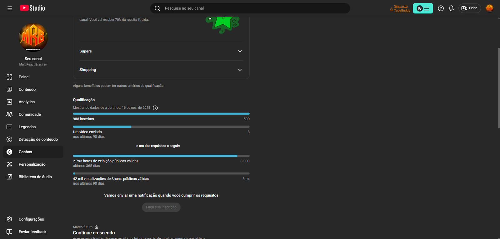 Canal top de mais quase monetizado, olhe os prints.