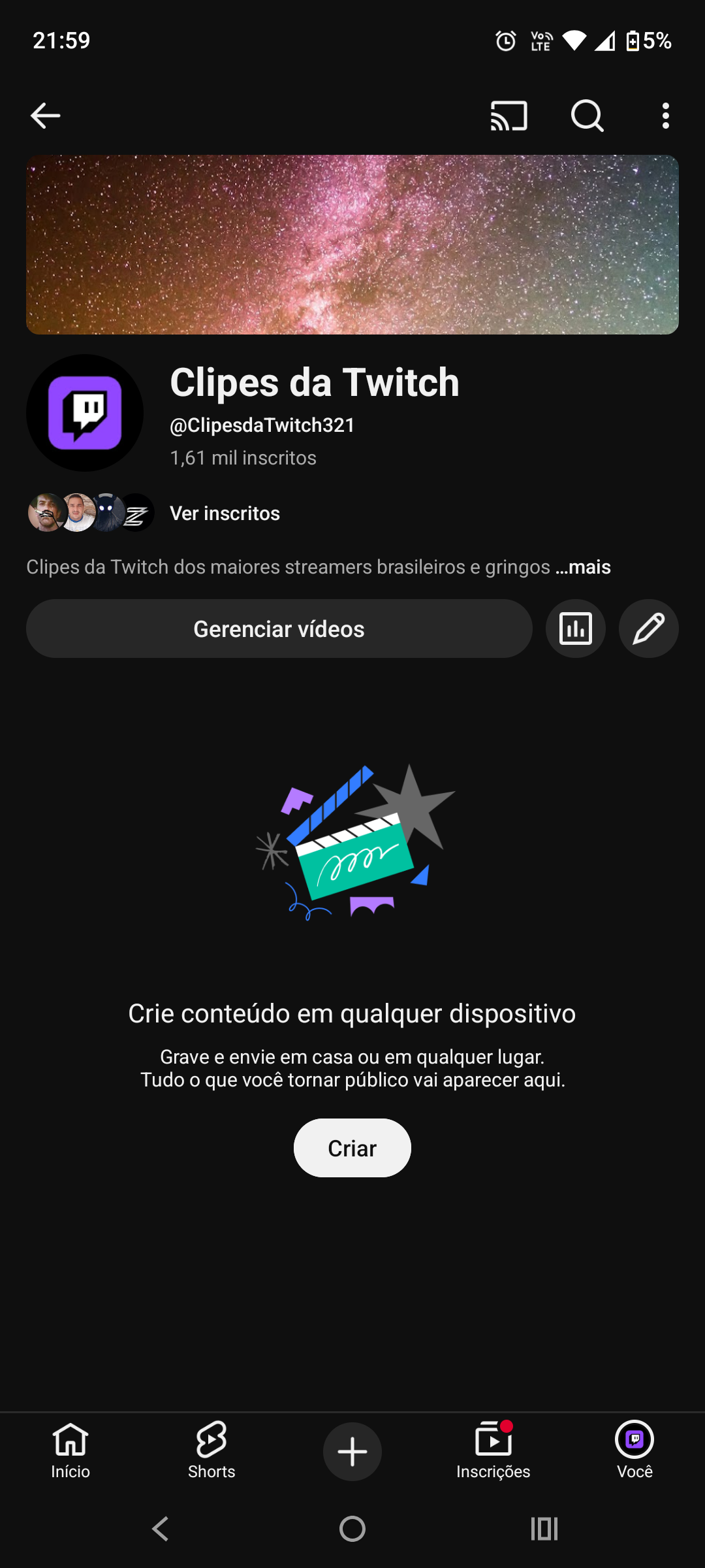 Canal no YouTube 1.61 mil inscritos sem vídeos