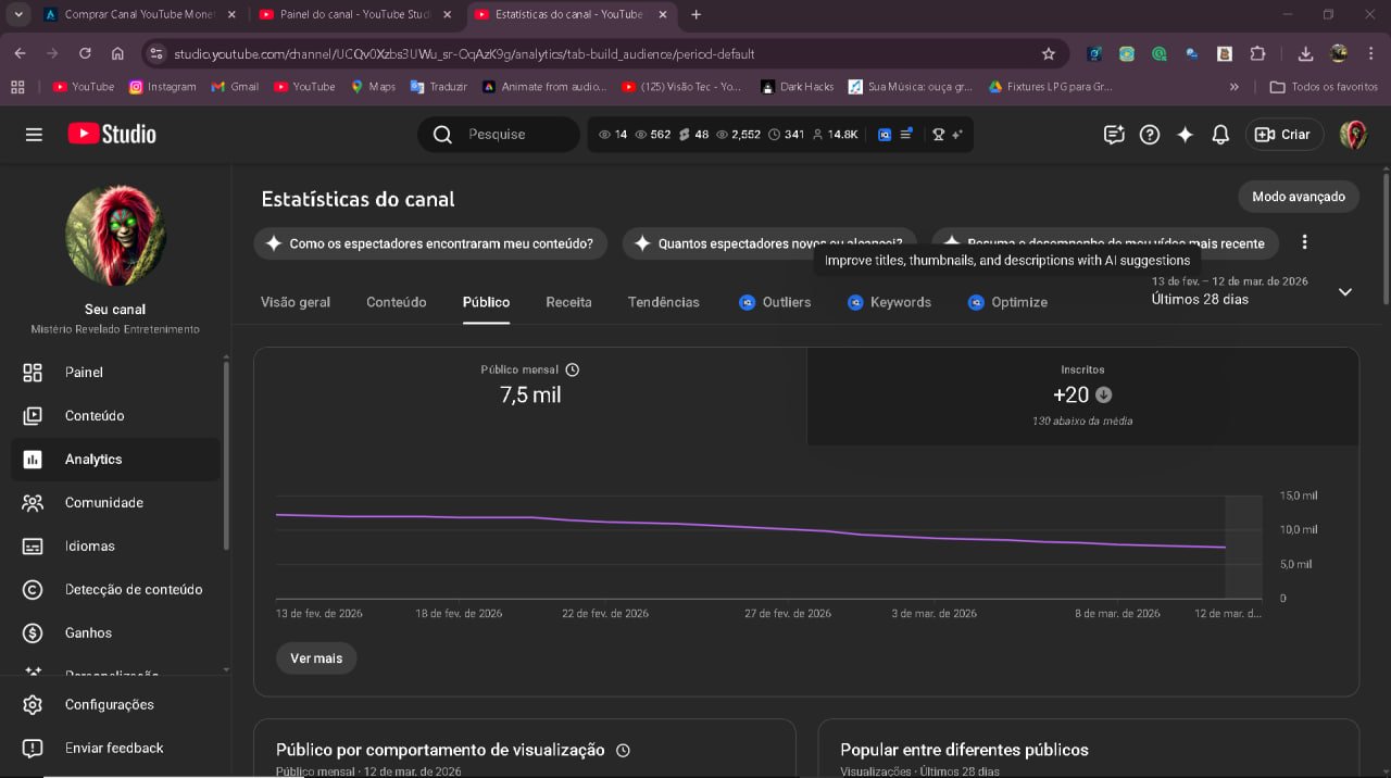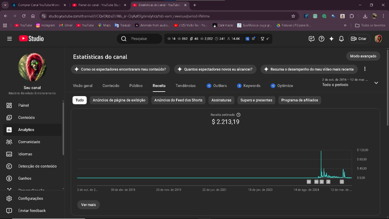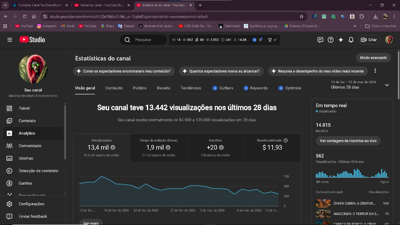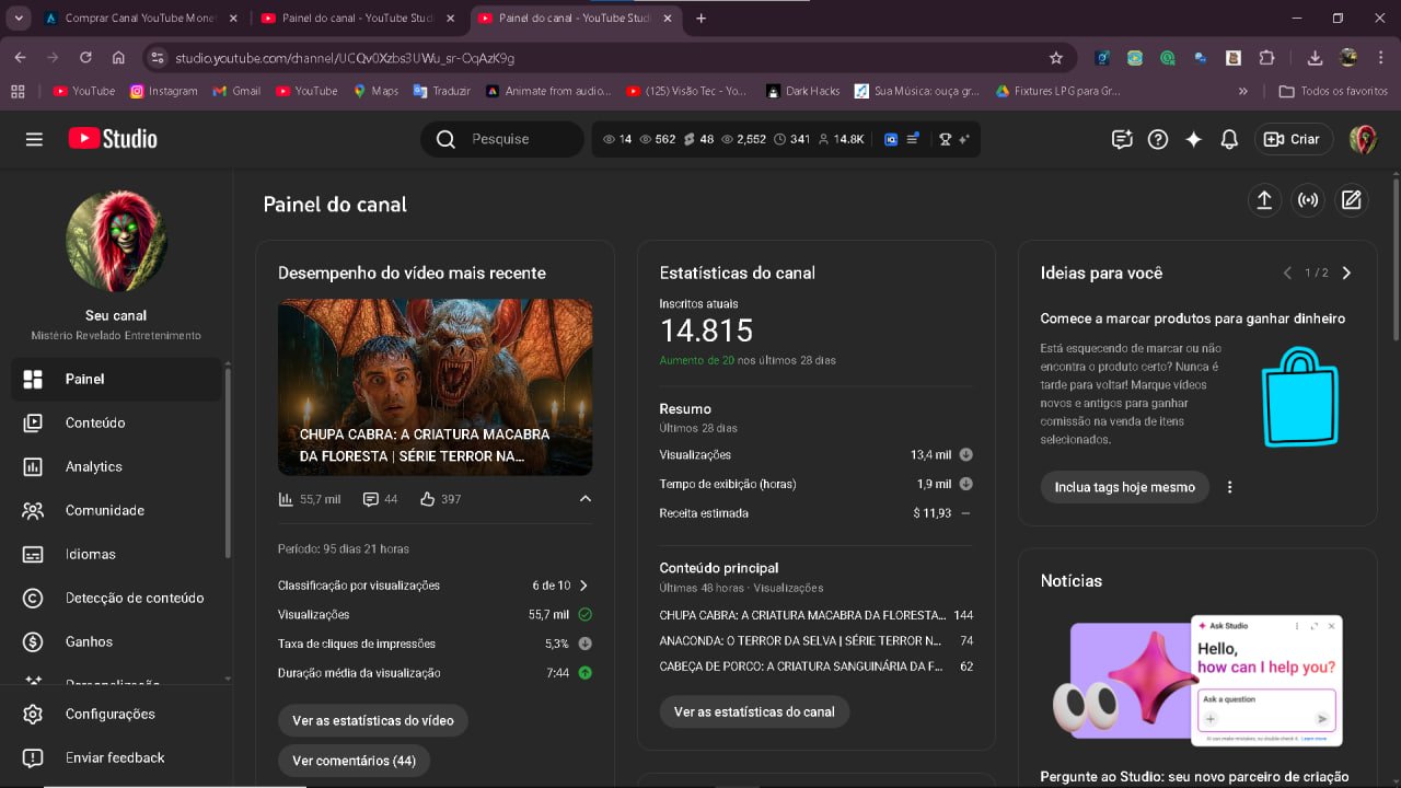 Estou vendendo um canal do YouTube já monetizado, com mais de 14 mil inscritos, no nicho de terror e mistérios da Amazônia. Ideal para quem quer entrar no YouTube já com audiência e monetização ativa, sem precisar começar do zero.