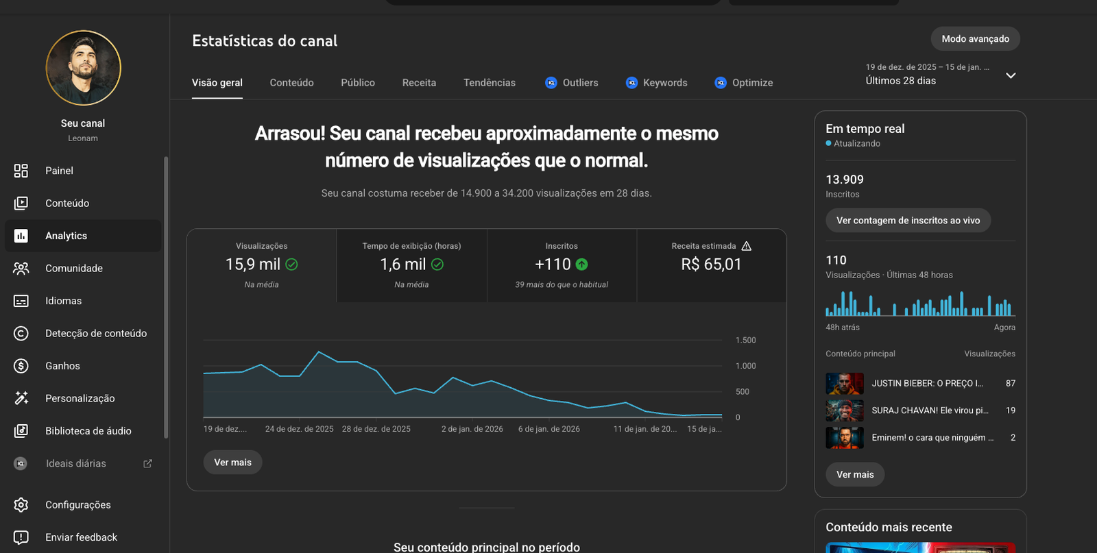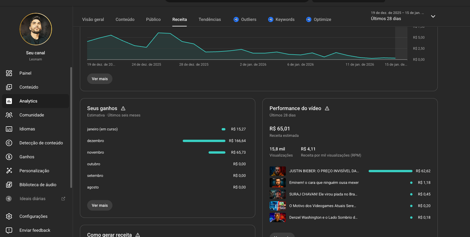 Monetização e patrocínios: Sim, Canal monetizado