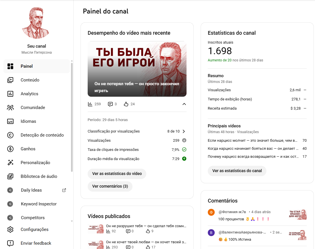 Canal russo monetizado, com potencial de viralização, como tenho outros projetos não me dediquei nesse o suficiente.
