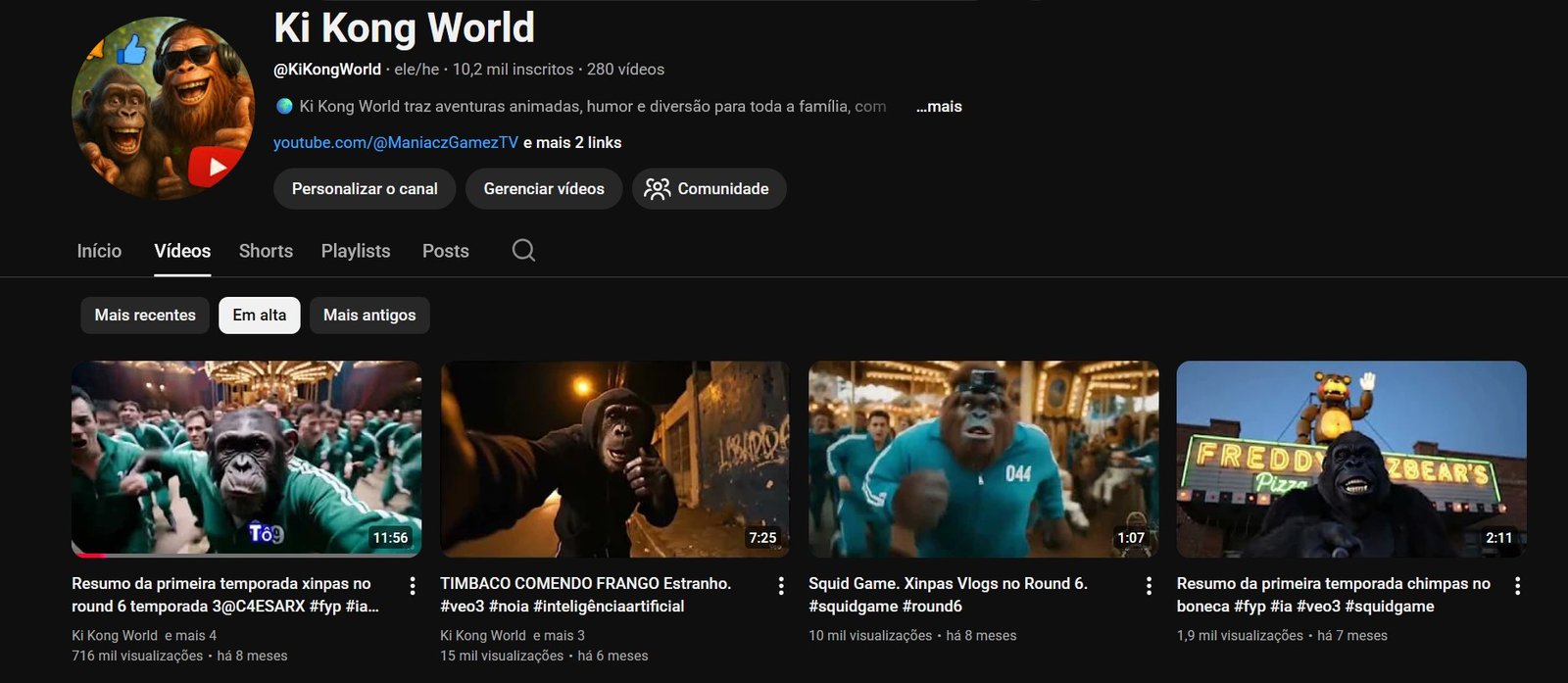 Canal Top de Entretenimento do Gorilão Vlogger com 10.200 inscritos, todo o conteúdo é meu criado por IA, tem videos no canal com quase 1 milhão de views