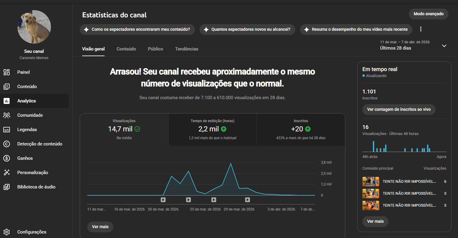 Canal Youtube • 1.100 Inscritos e 2.283 horas • Canal Ativo Em Ascenção – QUASE MONETIZADO