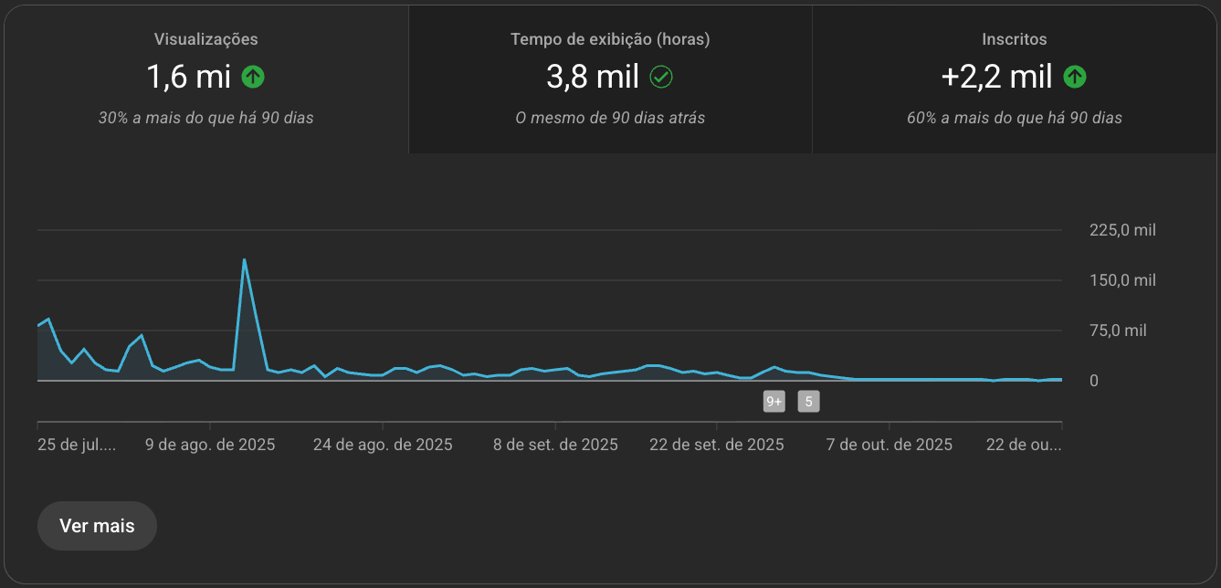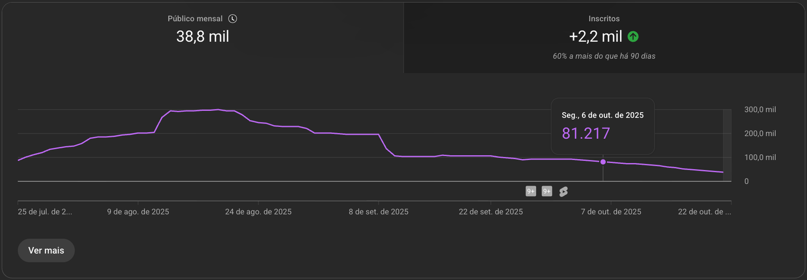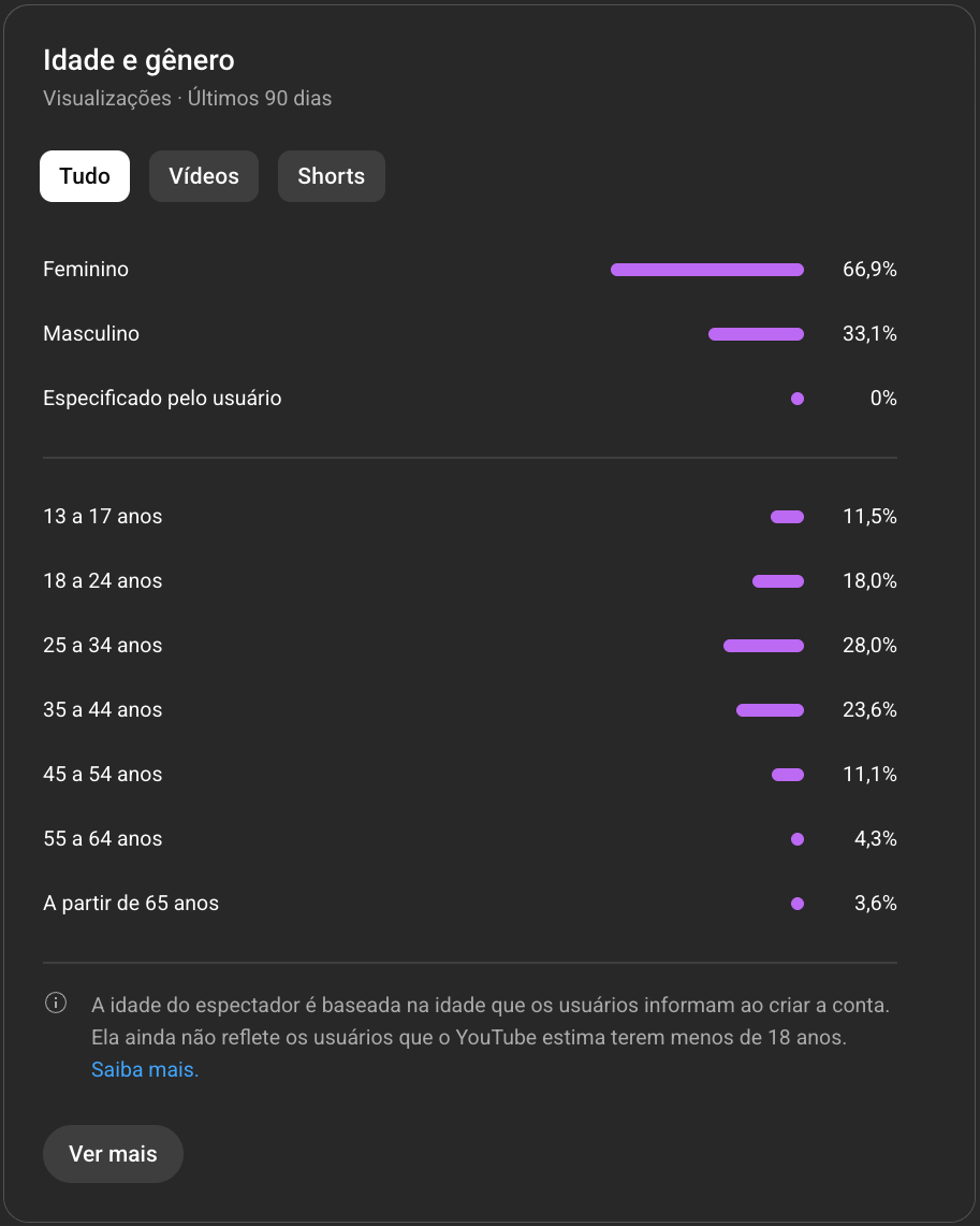 Canal ativo no YouTube com mais de 12 mil inscritos e 1,6 milhão de visualizações nos últimos 90 dias. Público majoritariamente feminino (25–34 anos), alta taxa de engajamento no Brasil e crescimento de 60% em inscritos.