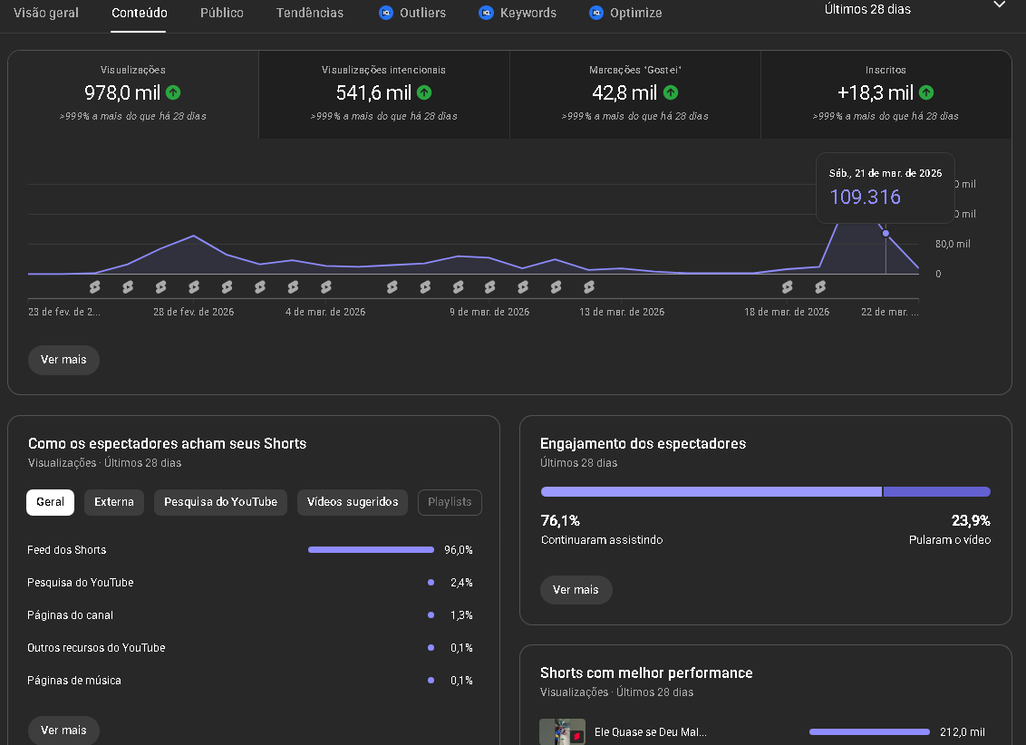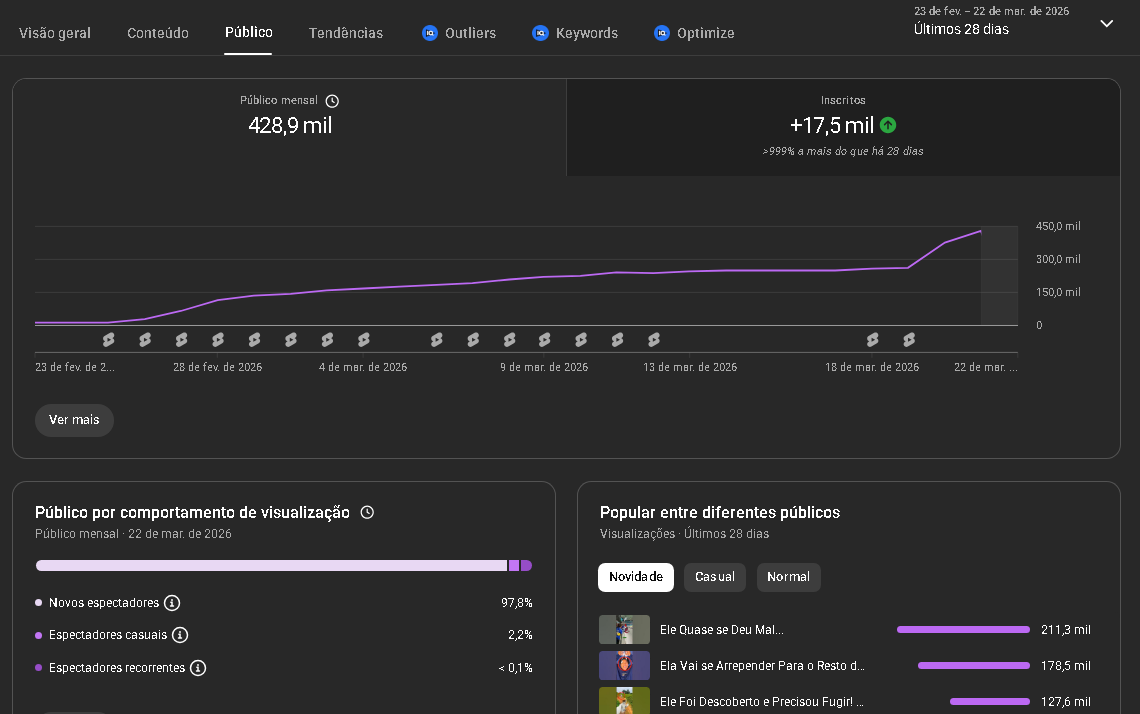 Vendo canal do YouTube com crescimento extremamente acelerado, atingindo 20.000 inscritos e mais de 1.000.000 de visualizações em menos de 30 dias.