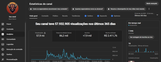 Deixei o canal de lado depois tentei outras coisas nele e então perdi a monetização por “conteúdo falso”, mas tinha dias que me dava 1 MILHÃO de views por dia.