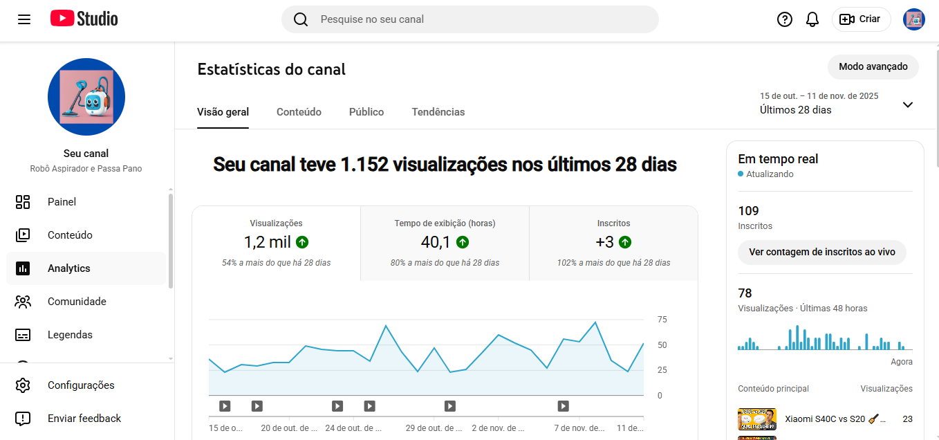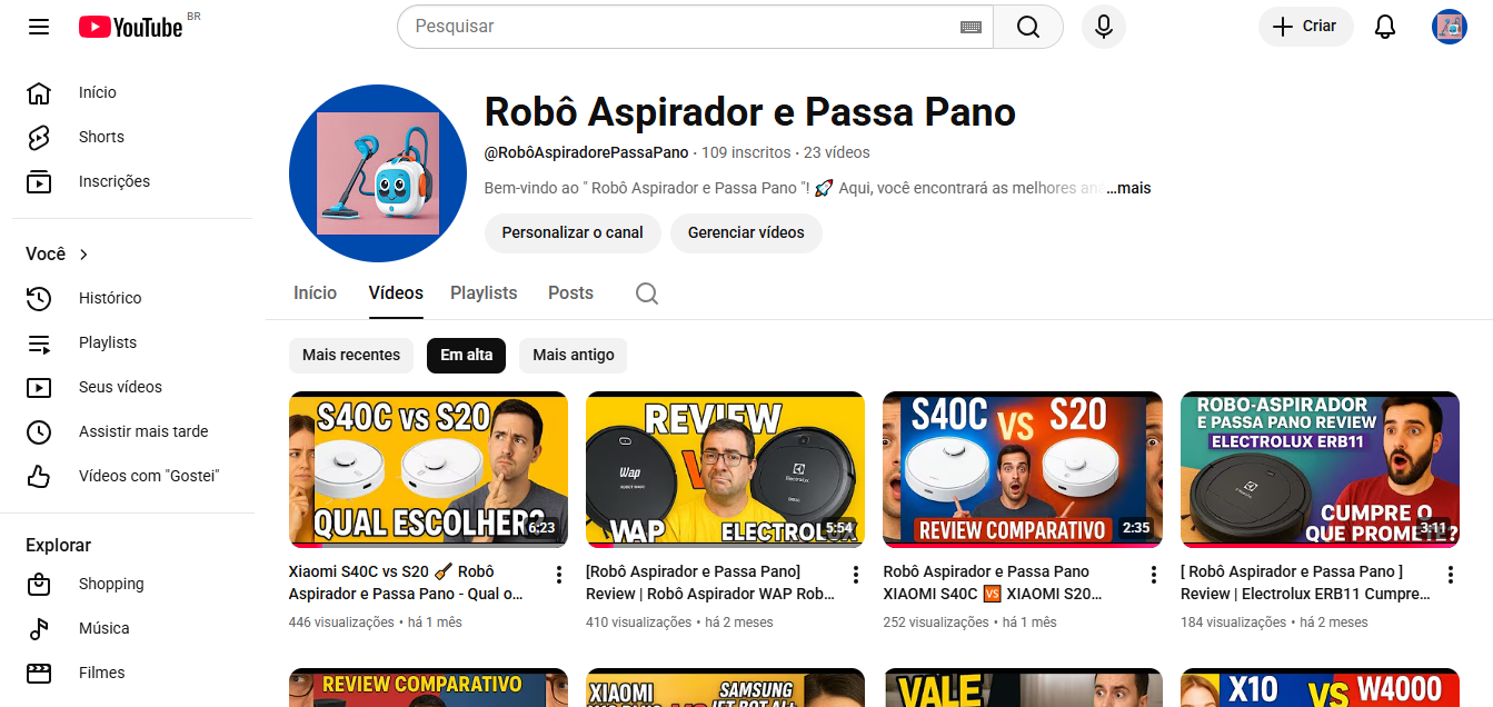 Canal Youtube super nicho ( Robô Aspirador e Passa Pano ) 109 Inscritos;