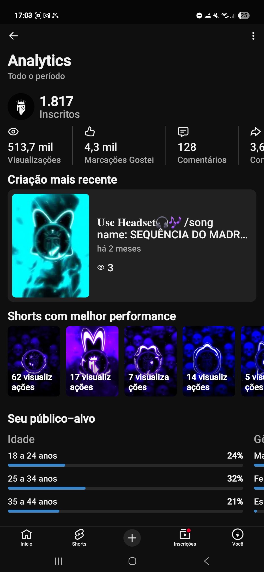 Conta com 1.817 inscritos e já possui histórico de monetização a uns meses atrás, sendo uma excelente oportunidade para quem deseja investir em um canal pronto e consolidado. Canal um pouco parado agora porque não uso mais faz um tempo, mas ele está quente para novos conteúdos caso queira mudar o nicho.