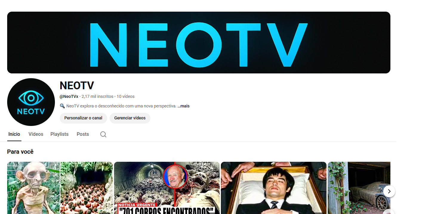 Canal do YouTube em português do Brasil, com o nome NEOTV, disponível para venda. O canal encontra-se ativo, tecnicamente saudável e com base já construída, sendo uma excelente oportunidade para criadores ou investidores que desejam iniciar ou reformular um projeto sem começar do zero.