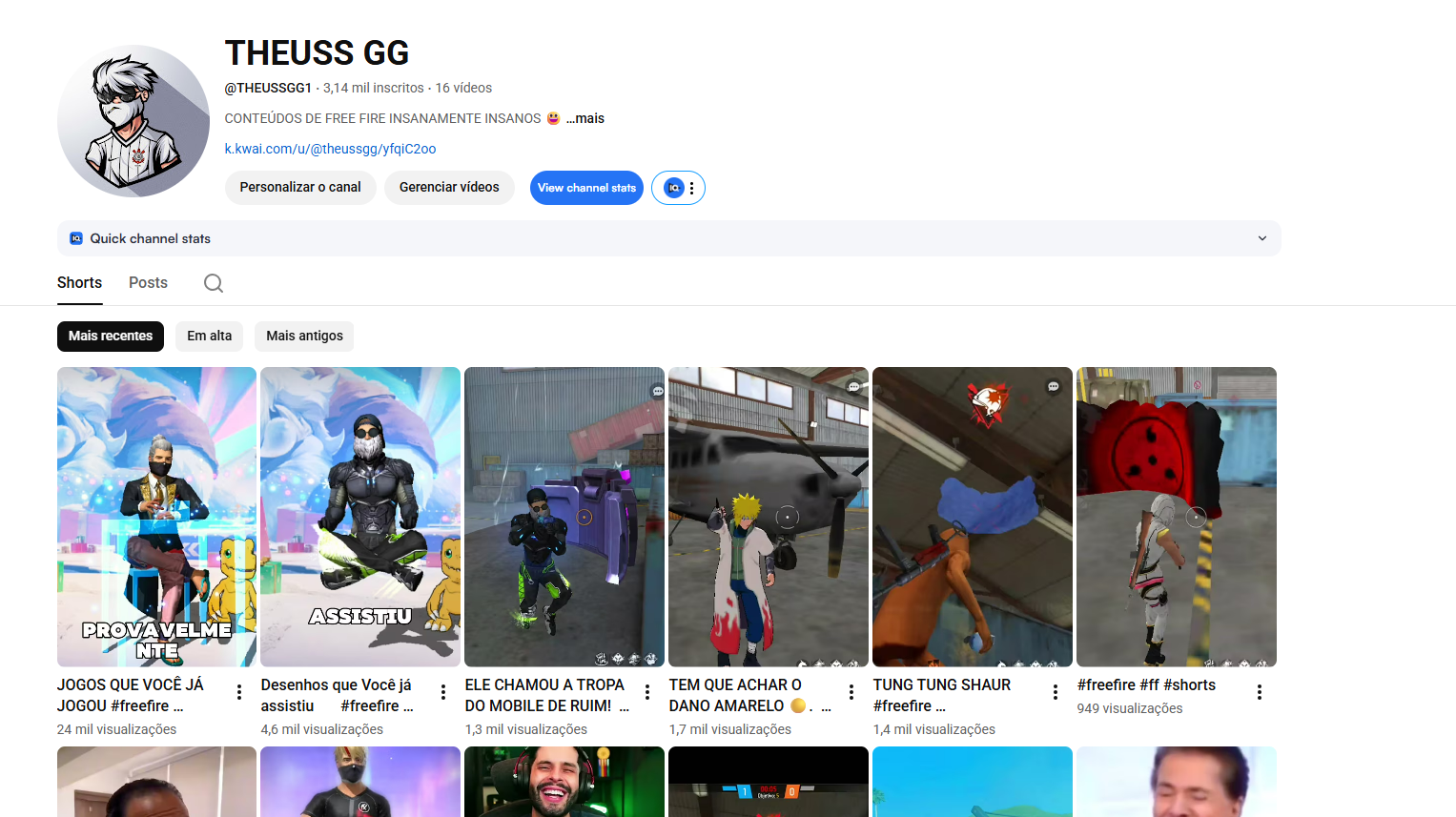 Canal de Youtube nichado em Free Fire, com conteúdo ativo em Shorts, ideal para quem quer crescer rápido no nicho gamer.