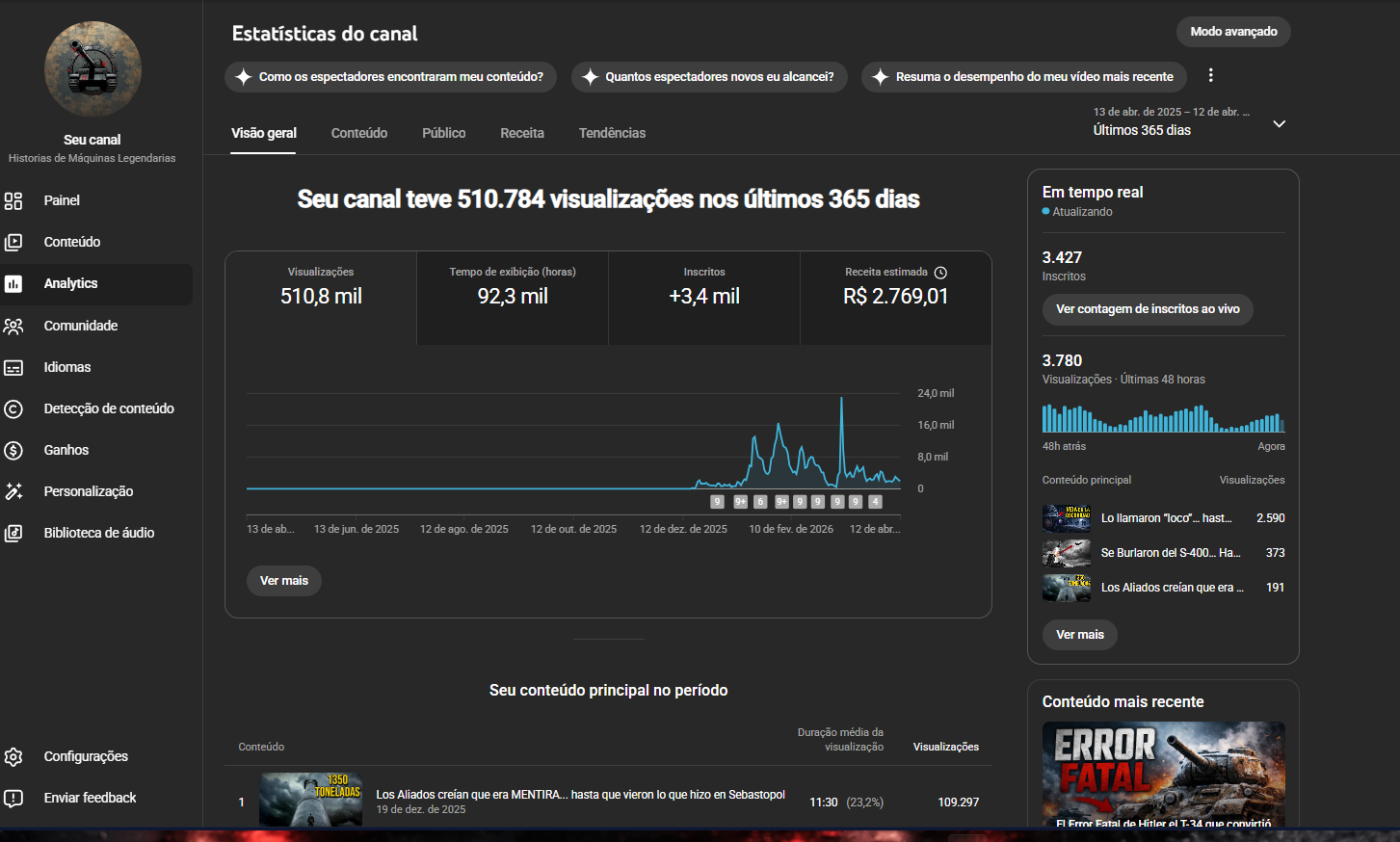 Canal de YouTube en el nicho de historia militar y máquinas de guerra, con audiencia ya validada en el mercado hispanohablante. Ideal para creadores o inversores que buscan un canal listo para escalar dentro de un nicho altamente viral.