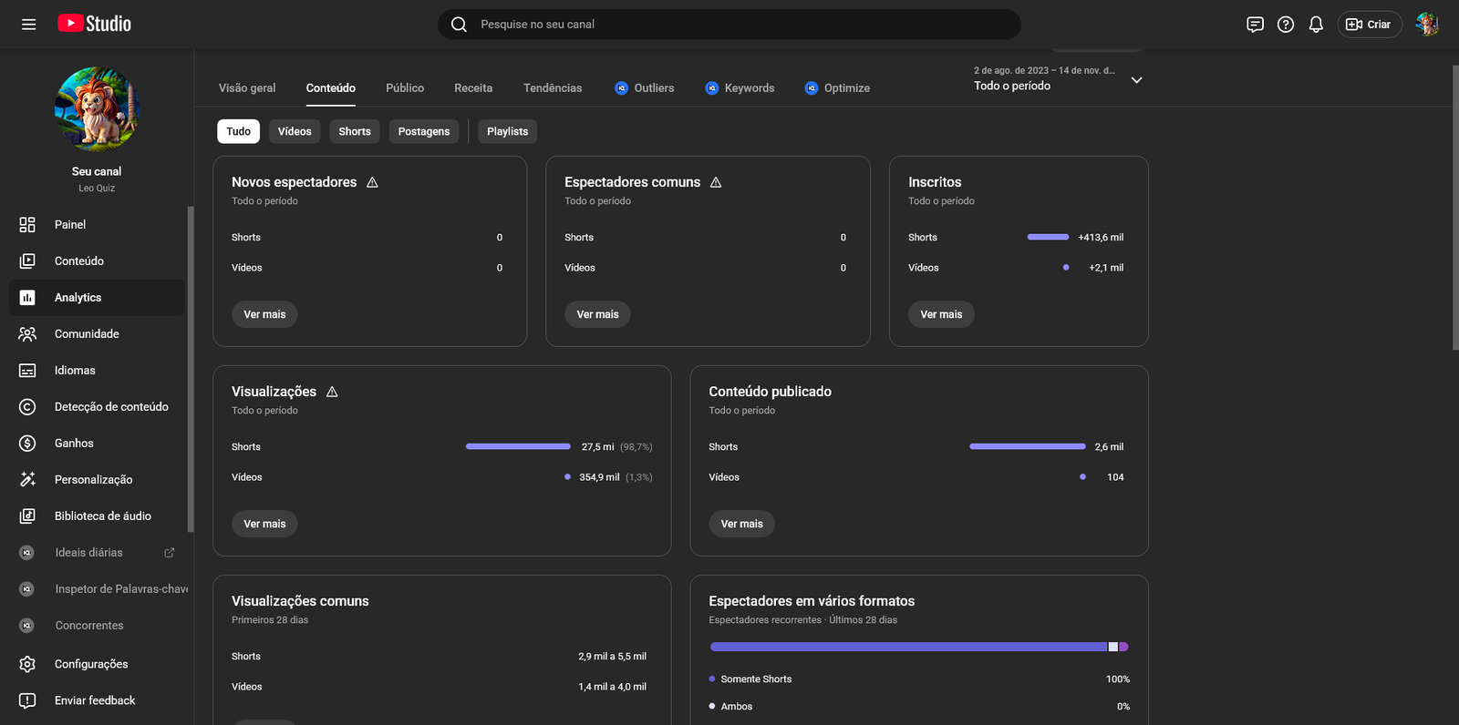 – Canal completo com todos os vídeos publicados e base de inscritos