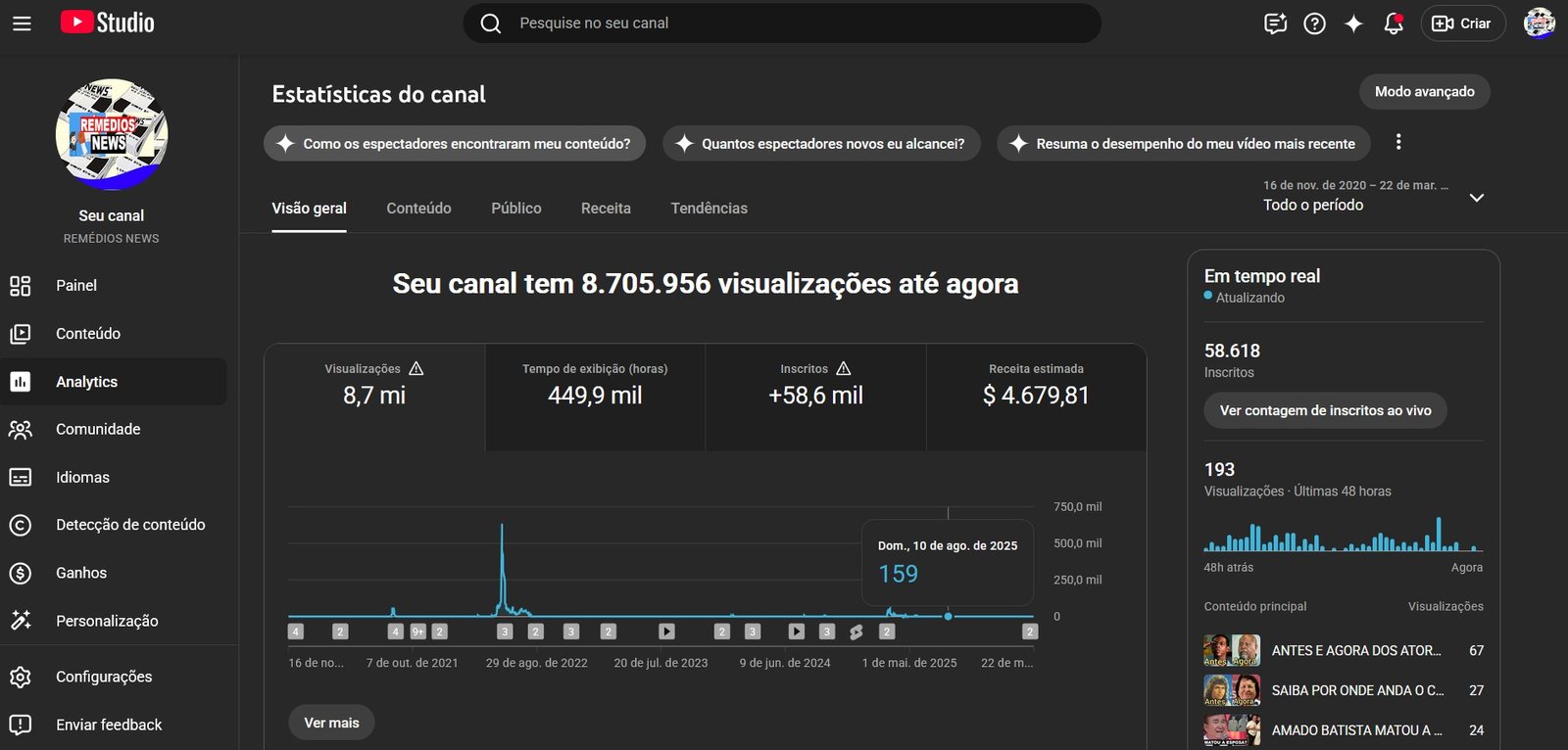 O canal Remédios News já conta com mais de 58 mil inscritos, construídos com consistência dentro do nicho de famosos — um dos mais consumidos e virais da plataforma.