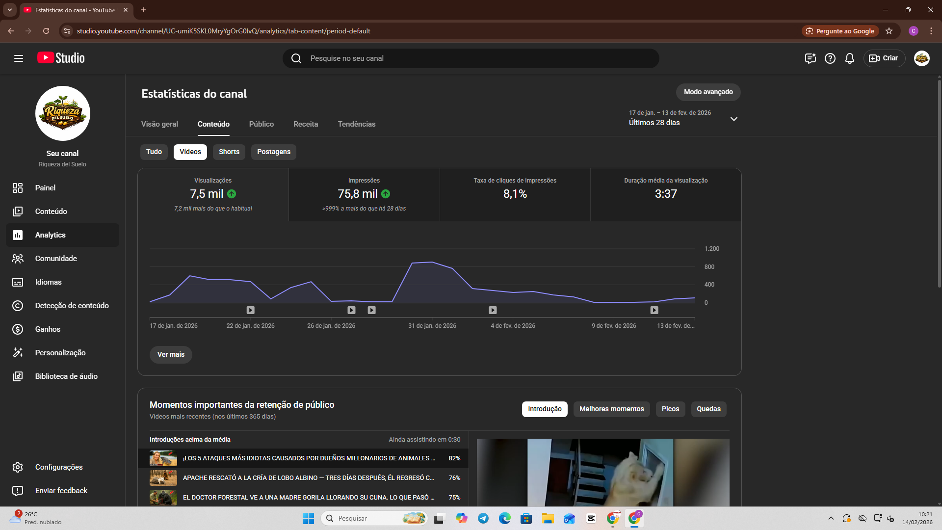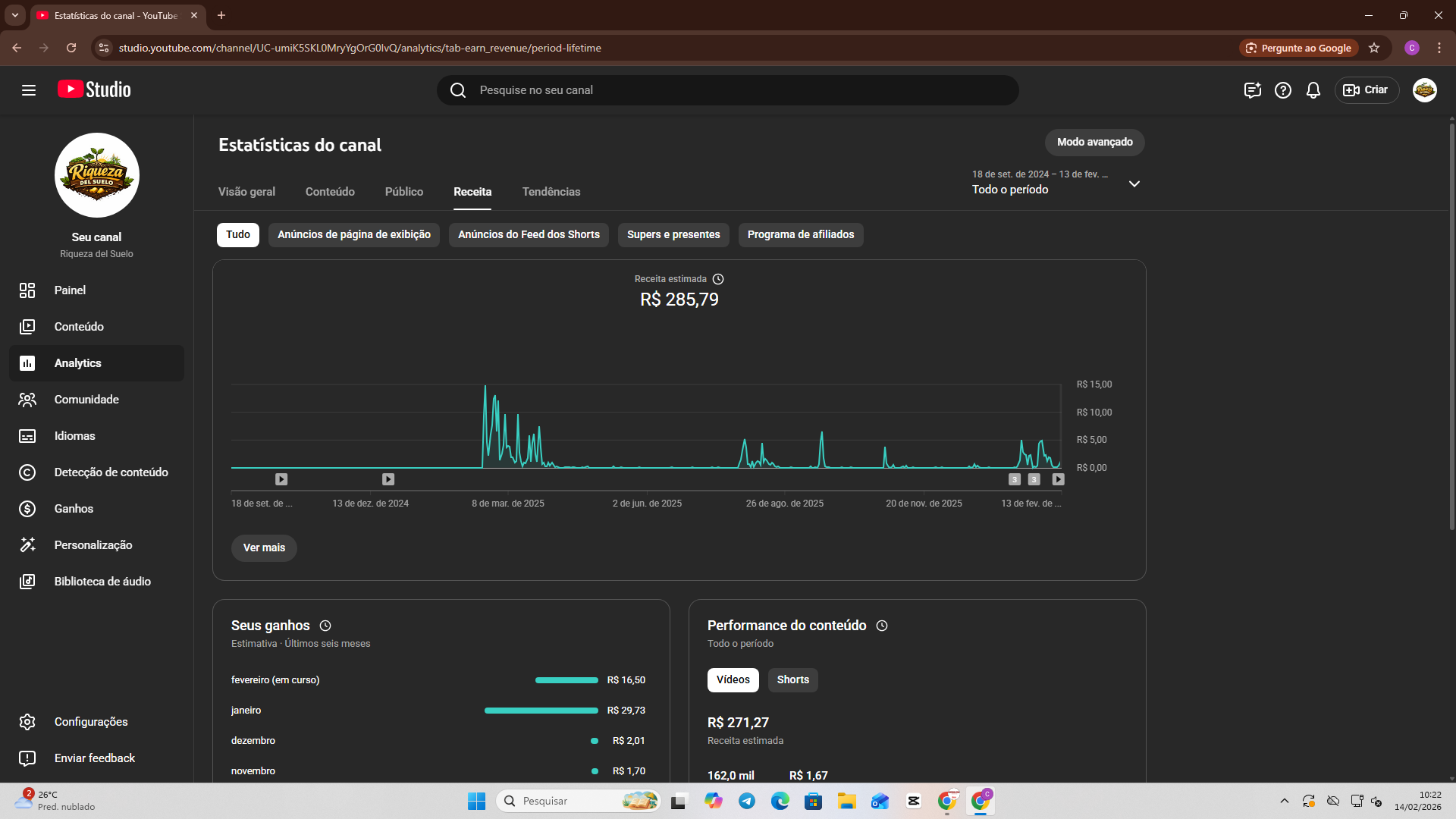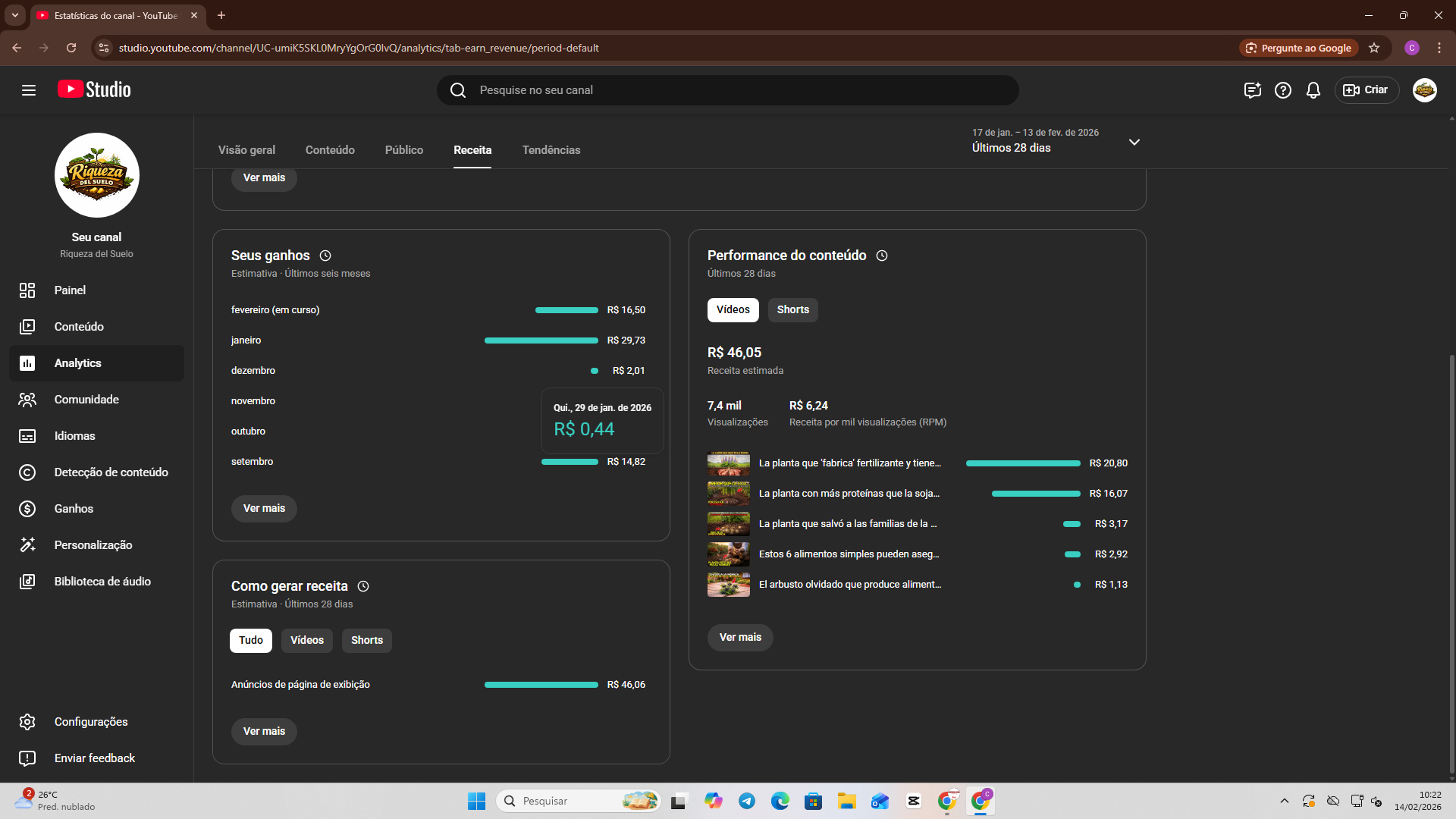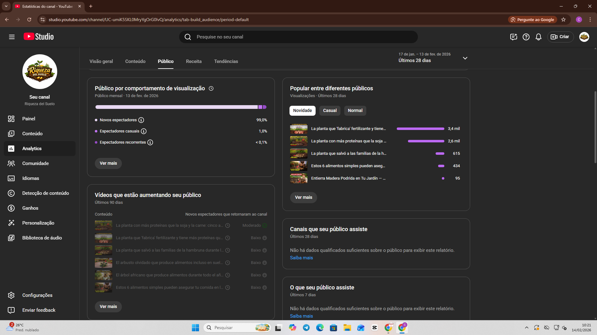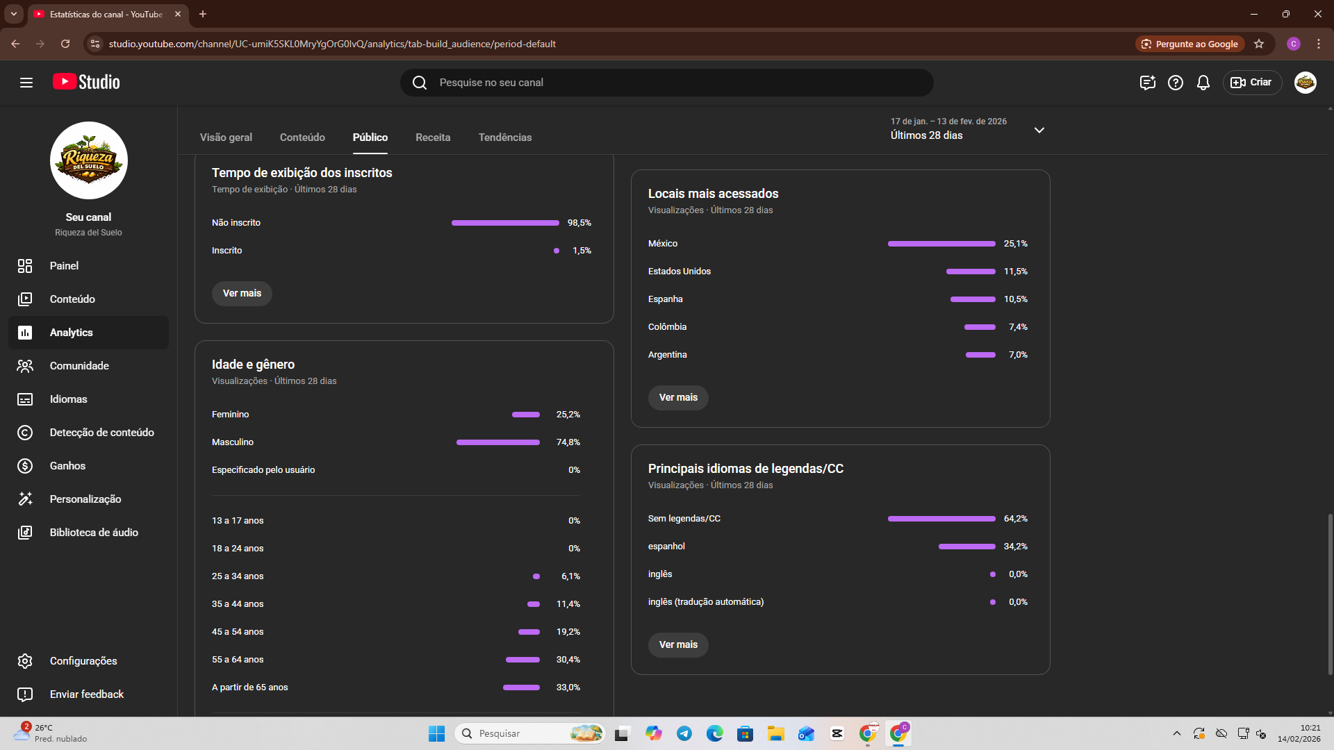 Oportunidade para quem quer entrar no YouTube já faturando. Canal estruturado no nicho de plantas, agricultura e conhecimento natural, um dos mercados mais estáveis e evergreen da plataforma — conteúdo que nunca perde demanda. 📊 Dados reais do canal: ✅ Canal monetizado ✅ Aproximadamente 162 mil visualizações ✅ Receita total superior a R$ 270 ✅ RPM de R$ 6,24 (acima da média de muitos canais iniciantes) ✅ Público internacional — forte presença em: México (25%) Estados Unidos Espanha Colômbia Argentina 👉 Excelente para quem deseja escalar conteúdo em espanhol. 🎯 Público altamente qualificado Maioria entre 35 e 65+ anos Audiência mais madura Maior poder de compra Melhor para vendas e afiliados Esse tipo de público costuma gerar RPM maior ao longo do tempo. 💰 Potencial de crescimento O canal já provou que: ✔ O algoritmo entrega ✔ O público responde ✔ O nicho monetiza
