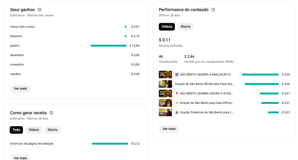 • Detalhes do Rendimento: Canal está com a monetização aprovada, porém eu não estou postando mais videos, por isso não está rendendo.
